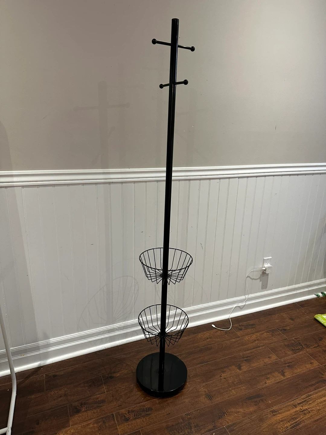 This is a black metal coat rack with a sturdy base. It has hooks at the top for hanging coats and hats. It also includes two wire baskets for extra storage. Perfect for entryway organization!