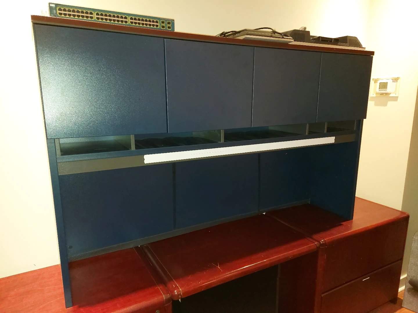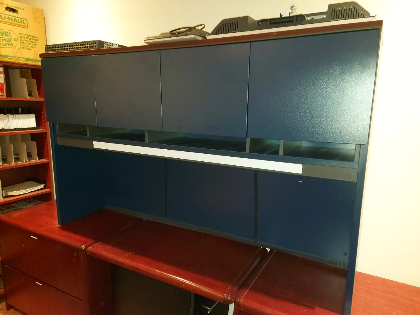Very sturdy, large desk hutch made of blue laminate. Has two cabinets (each has 2 doors) and a short shelf with divisions.