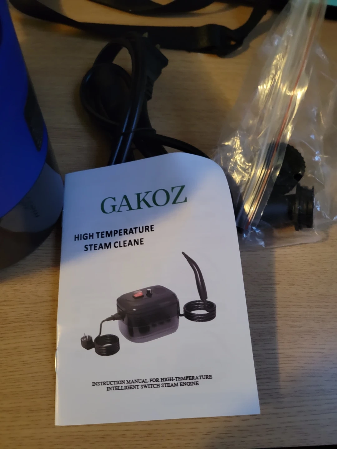 This GAKOZ steam cleaner is designed for high-temperature cleaning. It comes with various attachments and an instruction manual for easy operation. A handy tool for tackling tough grime!