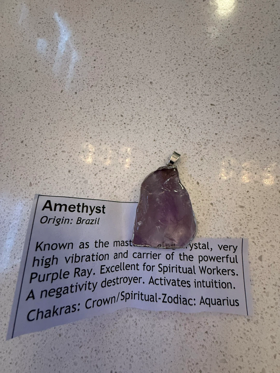Raw amethyst pendant. Origin: Brazil. Known as the master crystal, it's a very high vibration and carrier of the powerful Purple Ray. Excellent for spiritual workers. Activates intuition. This unique pendant could be used for meditation or as a statement piece for your jewellery collection.