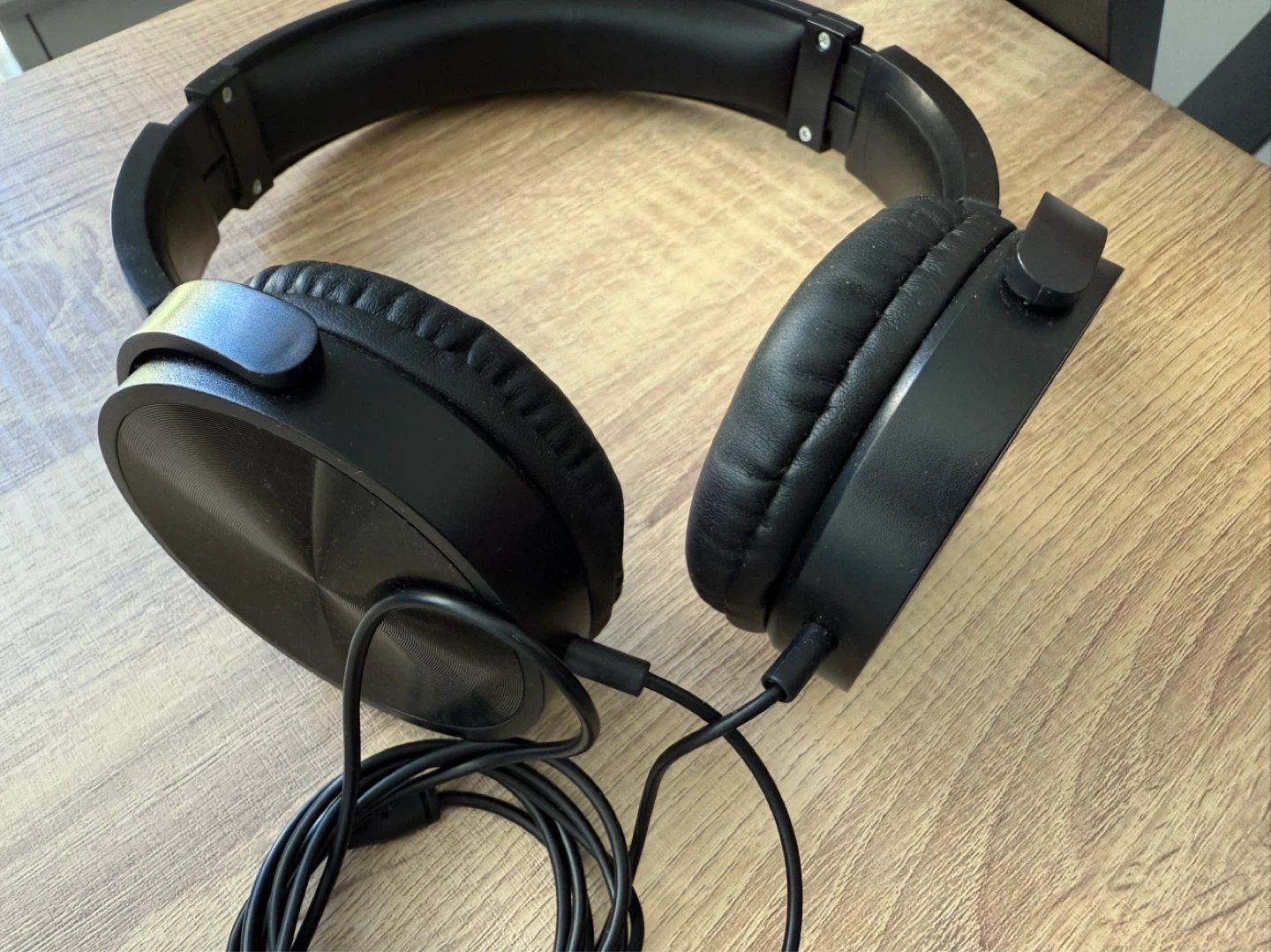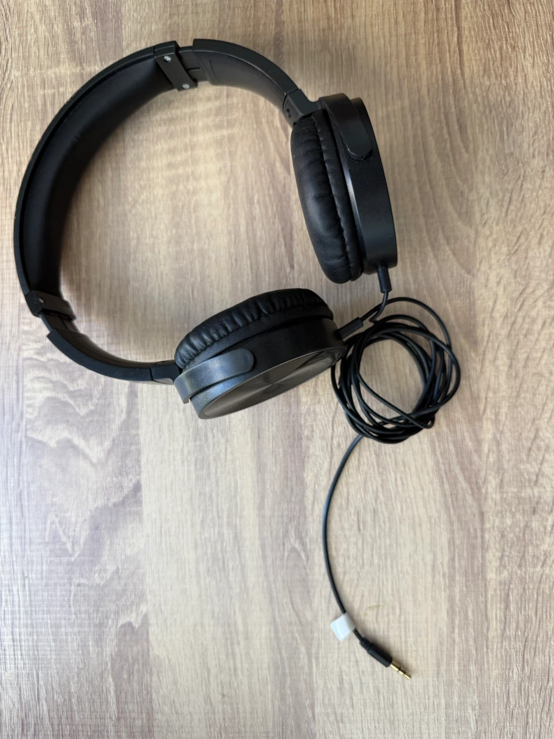 These black over-ear headphones have a foldable design and a standard 3.5mm audio jack. The earcups and headband are padded for comfort. They're great for listening to music or podcasts.