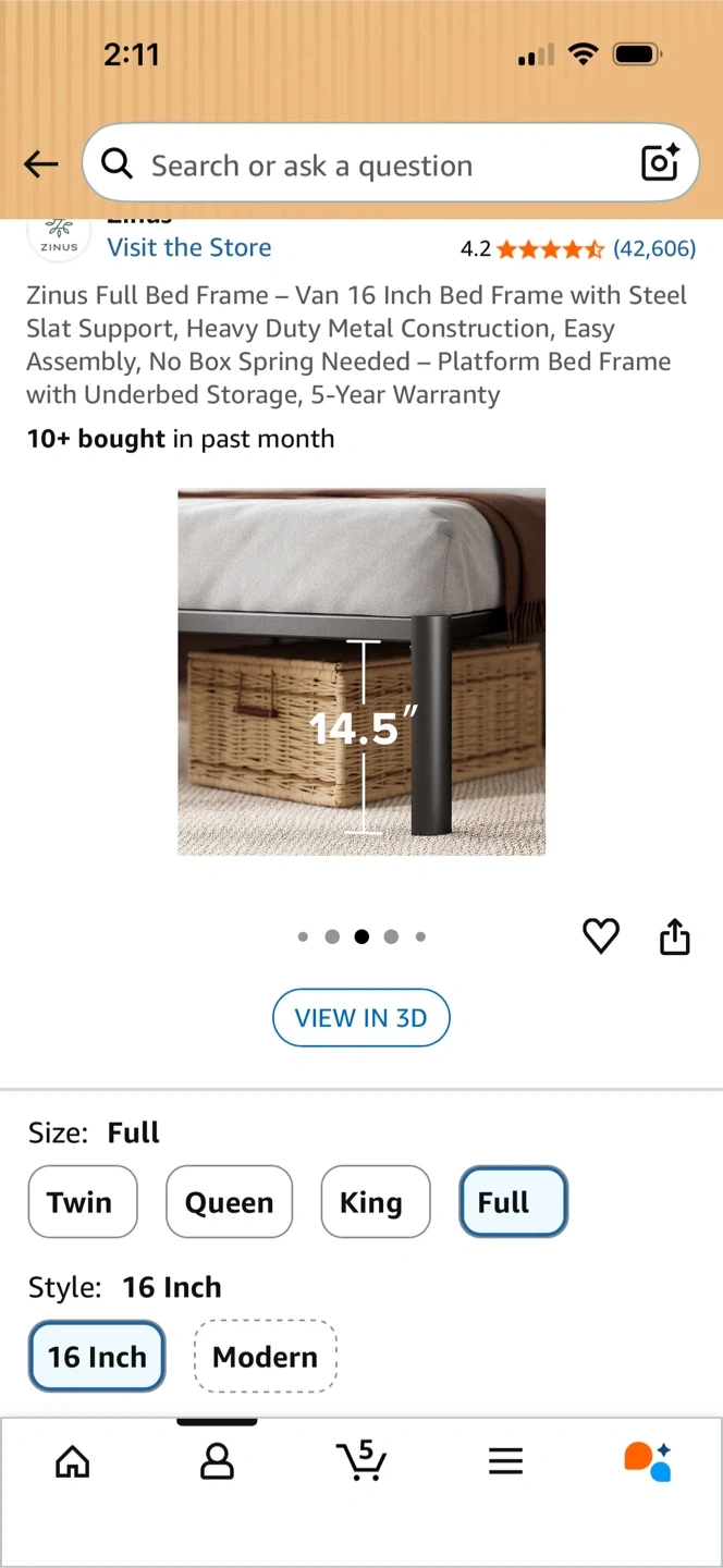 This Zinus Full bed frame features a 16-inch height with steel slat support and underbed storage. It has a heavy-duty metal construction and is easy to assemble. Its capacity is 700 lbs.