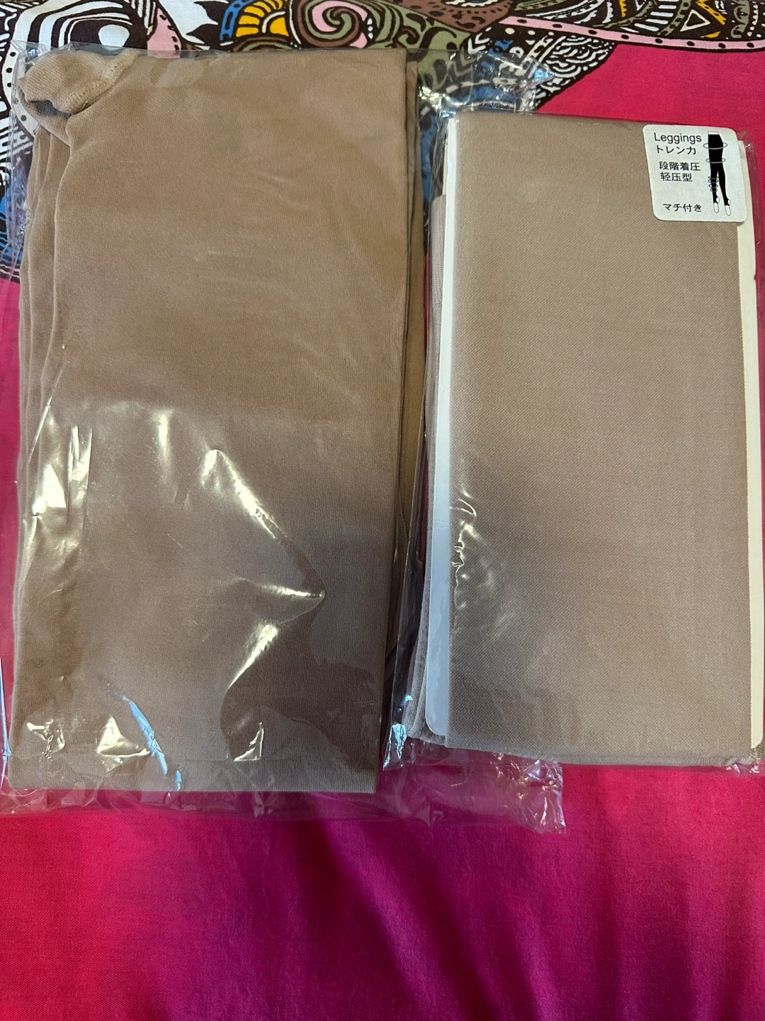 Two pairs of light compression leggings. They're a beige, skin-tone colour. One pair is a longer style, and the other has a gusset for comfort. Great for everyday wear!