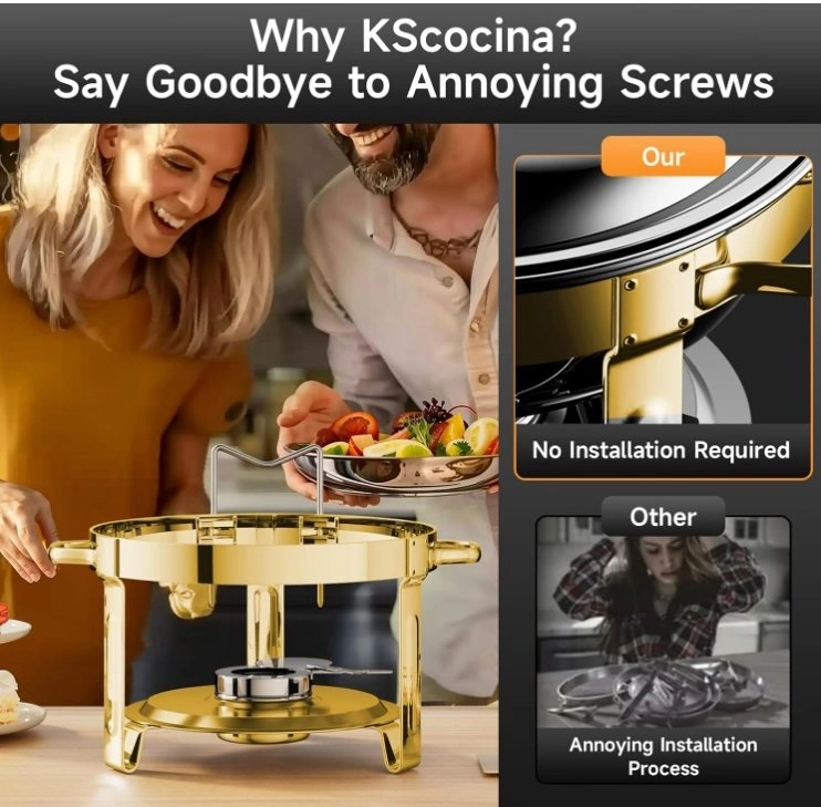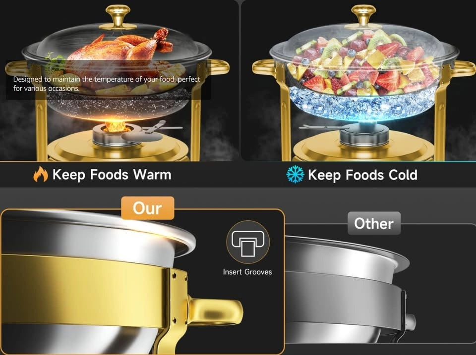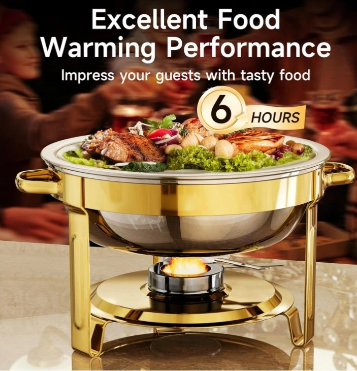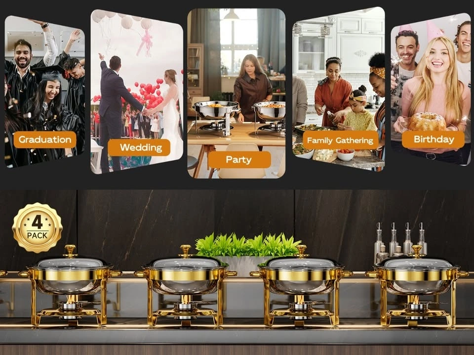 This is a 4-pack of 5QT round stainless steel chafing dishes, perfect for home parties, Christmas gatherings, or catering events. They are made from high-quality stainless steel for excellent food warming and durability. These chafing dishes use advanced water vapor circulation to keep your food warm and fresh for any occasion.
