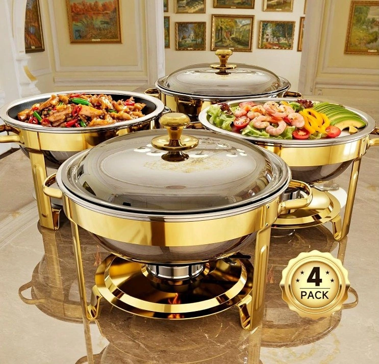 This is a 4-pack of 5QT round stainless steel chafing dishes, perfect for home parties, Christmas gatherings, or catering events. They are made from high-quality stainless steel for excellent food warming and durability. These chafing dishes use advanced water vapor circulation to keep your food warm and fresh for any occasion.