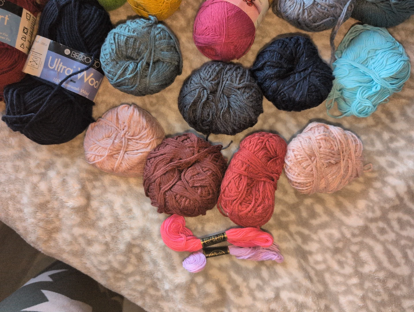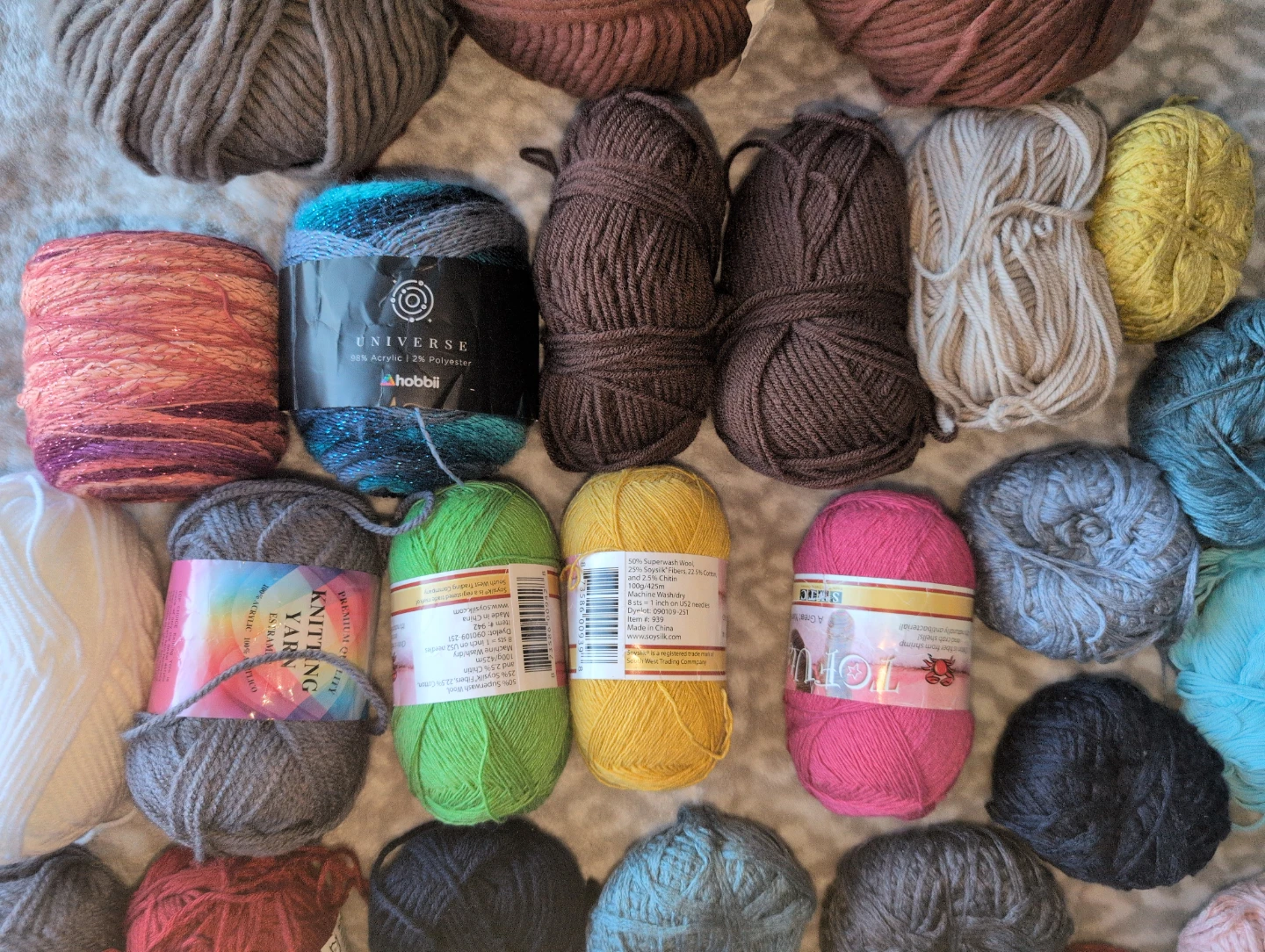 Assorted yarn skeins in various colors and textures. Also includes a set of crochet hooks in different sizes. Great for various knitting and crochet projects!