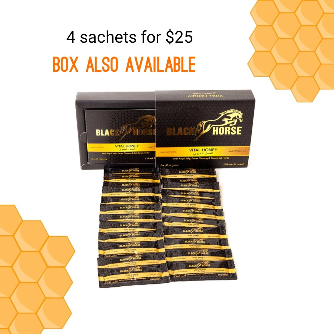 Four sachets of Black Horse Vital Honey. Box also available. Contains Royal Jelly, Panax Ginseng & Rainforest Herbs.