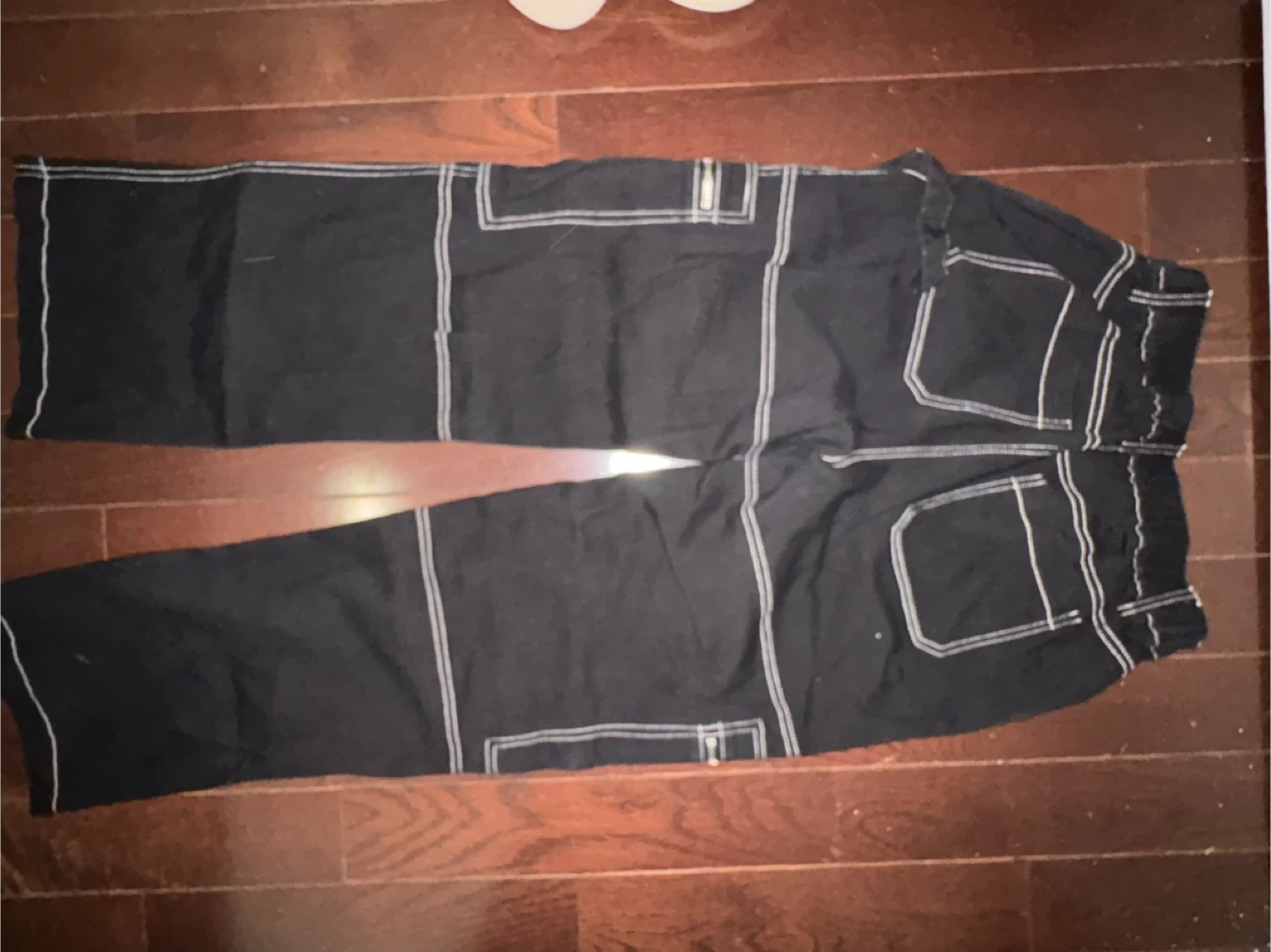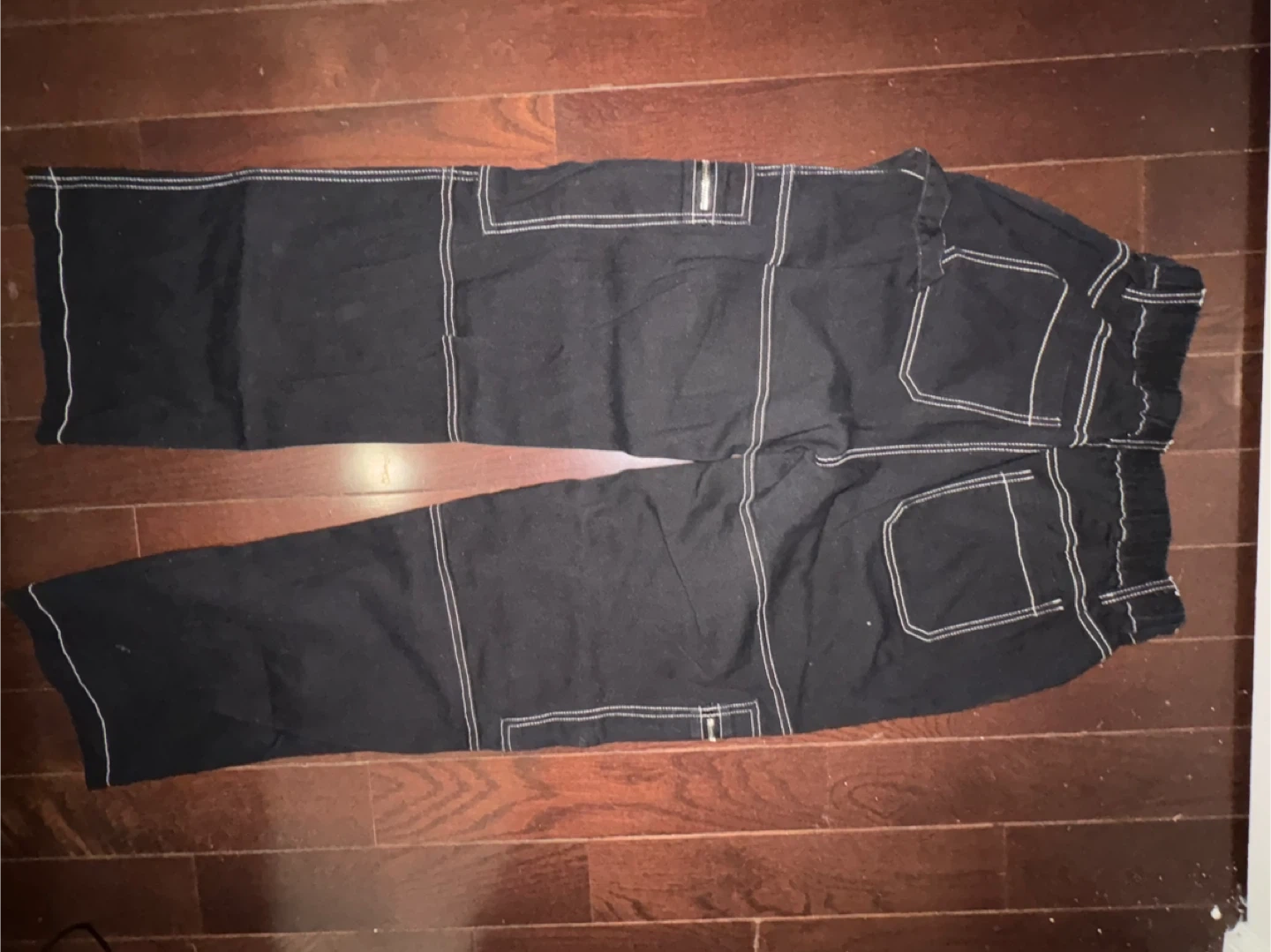 Black cargo pants from Faded Rose Essentials. Features contrast white stitching and multiple zipper pockets. Elastic waistband. Size medium. Made in China.