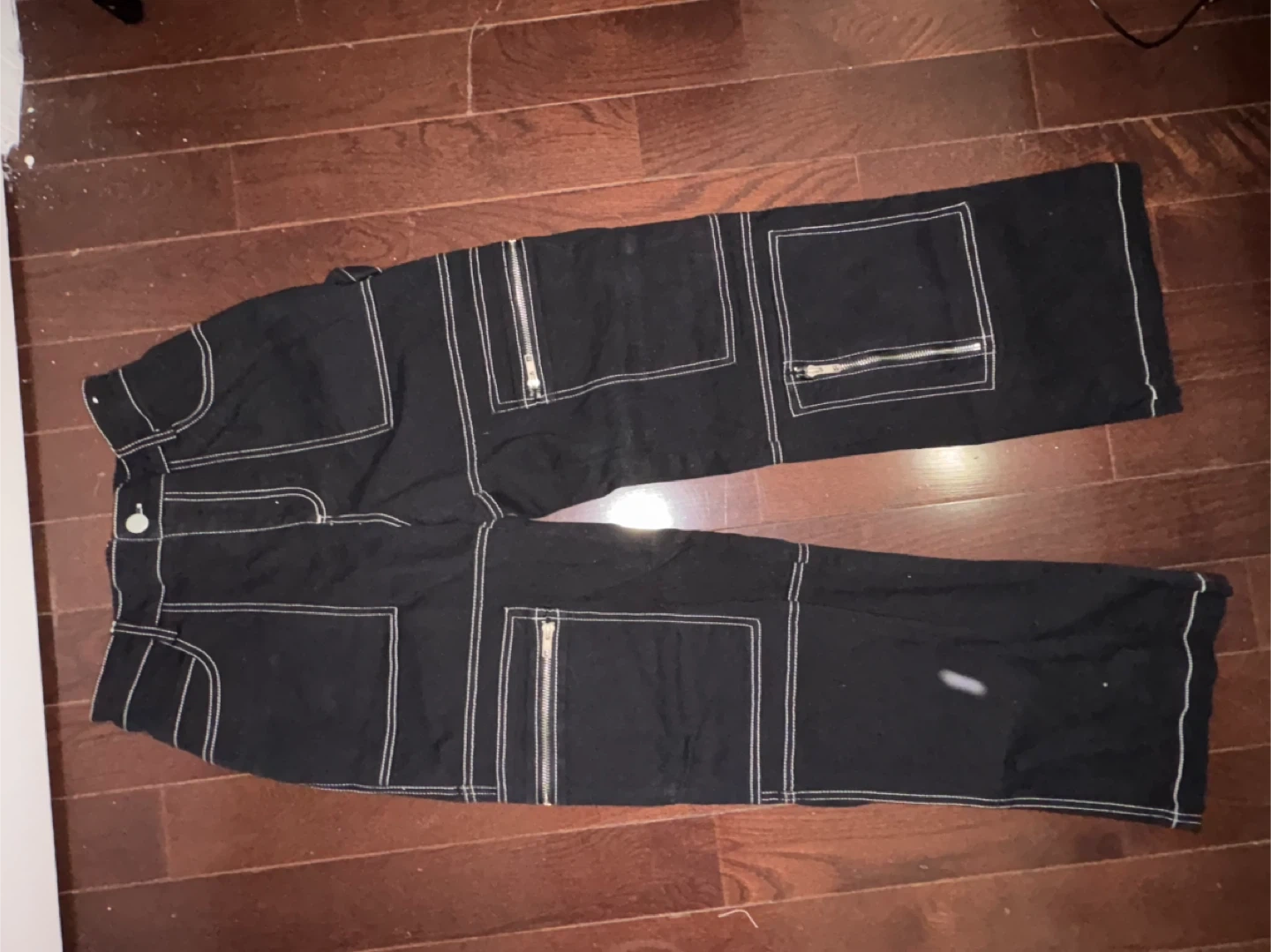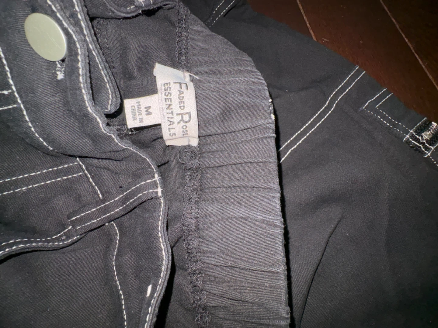 Black cargo pants from Faded Rose Essentials. Features contrast white stitching and multiple zipper pockets. Elastic waistband. Size medium. Made in China.