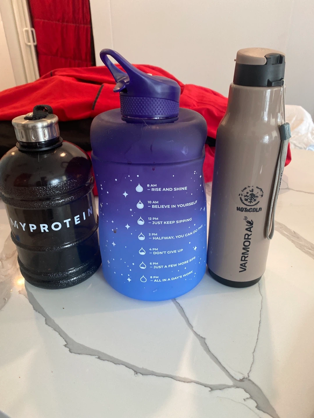 Move out sale Bundle includes a black Myprotein bottle and a grey Varmora insulated bottle. The blue gradient water bottle has time markings for daily hydration goals. Plastic and insulated materials.