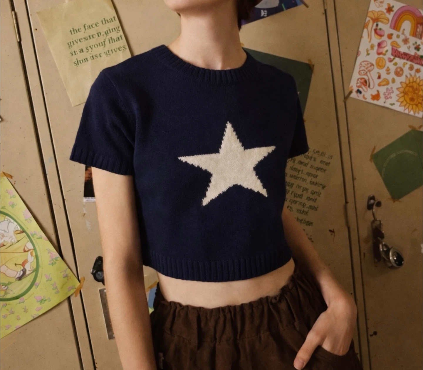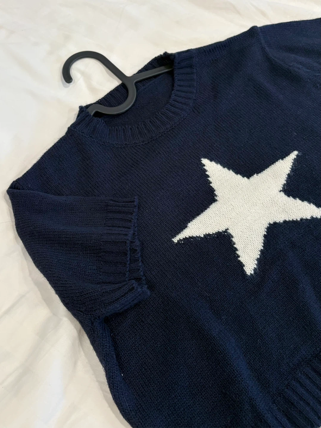 Navy blue cropped sweater with a large white star graphic on the front. It's made of a knitted material with short sleeves and a crew neck. This top is perfect for casual wear, easily paired with jeans or skirts.