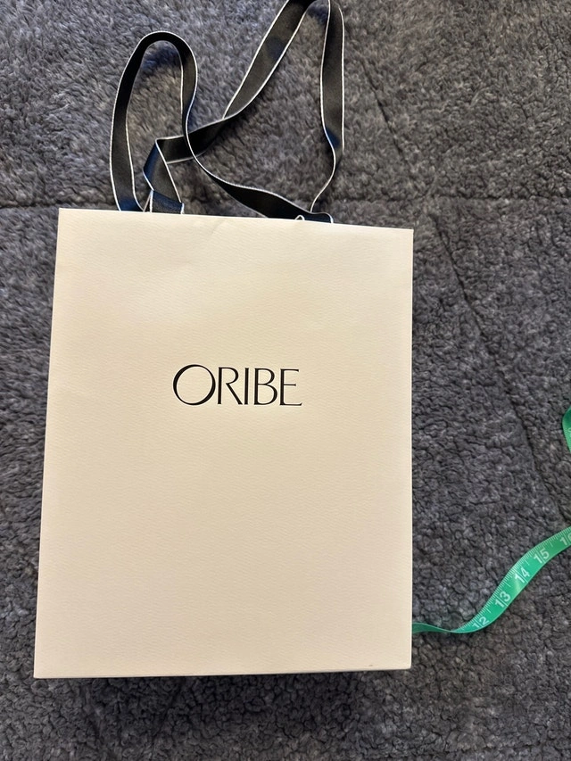 This Oribe shopping bag is perfect for anyone who loves the brand or needs a stylish way to carry items! It's in like-new condition. The bag measures approximately 9 inches wide and 11.5 inches tall. It's ideal for small gifts or organizing your favourite hair products. Please note this is a used item. Brand: Oribe. Dimensions: 9" W x 11.5" H. Colour: Cream with black accents. Material: High-quality, durable paper. I'm asking $10 for this lovely Oribe shopping bag. Prices for similar shopping bags range from $8-$15 on Kijiji. If you're seeing this ad, the bag is still available.