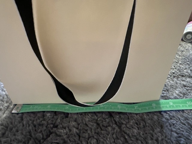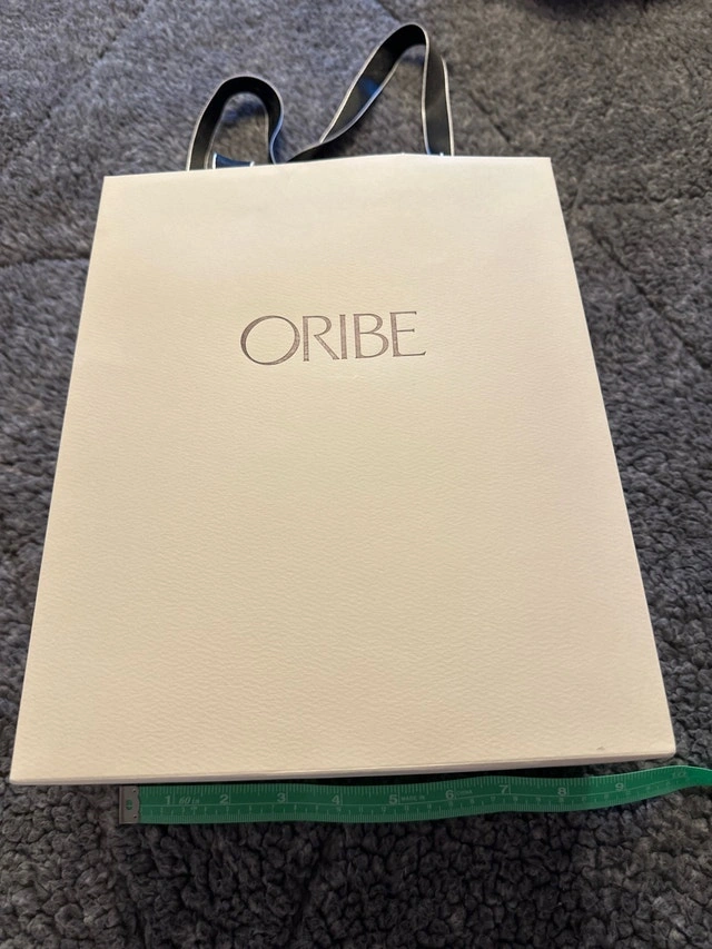 This Oribe shopping bag is perfect for anyone who loves the brand or needs a stylish way to carry items! It's in like-new condition. The bag measures approximately 9 inches wide and 11.5 inches tall. It's ideal for small gifts or organizing your favourite hair products. Please note this is a used item. Brand: Oribe. Dimensions: 9" W x 11.5" H. Colour: Cream with black accents. Material: High-quality, durable paper. I'm asking $10 for this lovely Oribe shopping bag. Prices for similar shopping bags range from $8-$15 on Kijiji. If you're seeing this ad, the bag is still available.