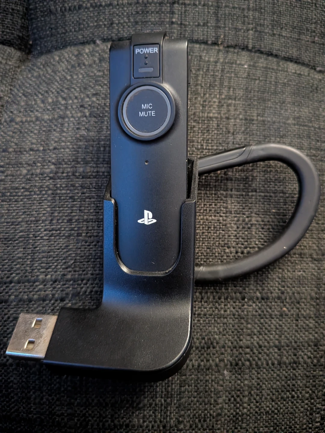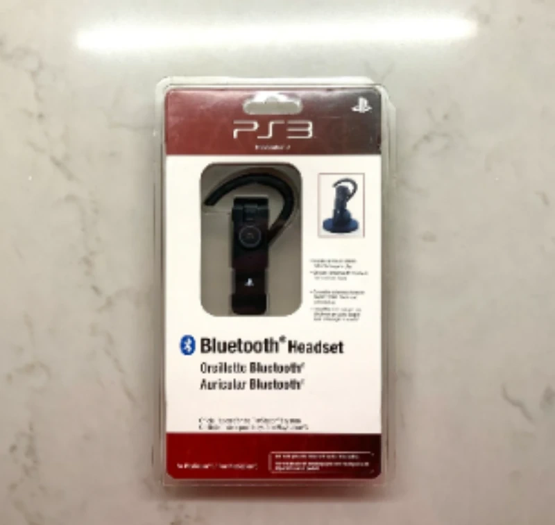 This is a Sony PS3 Bluetooth Headset. It's black and connects wirelessly. It has a mic mute button and a power button. No Box Sold As Is