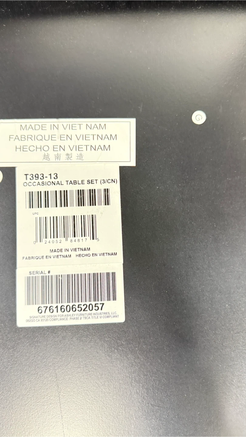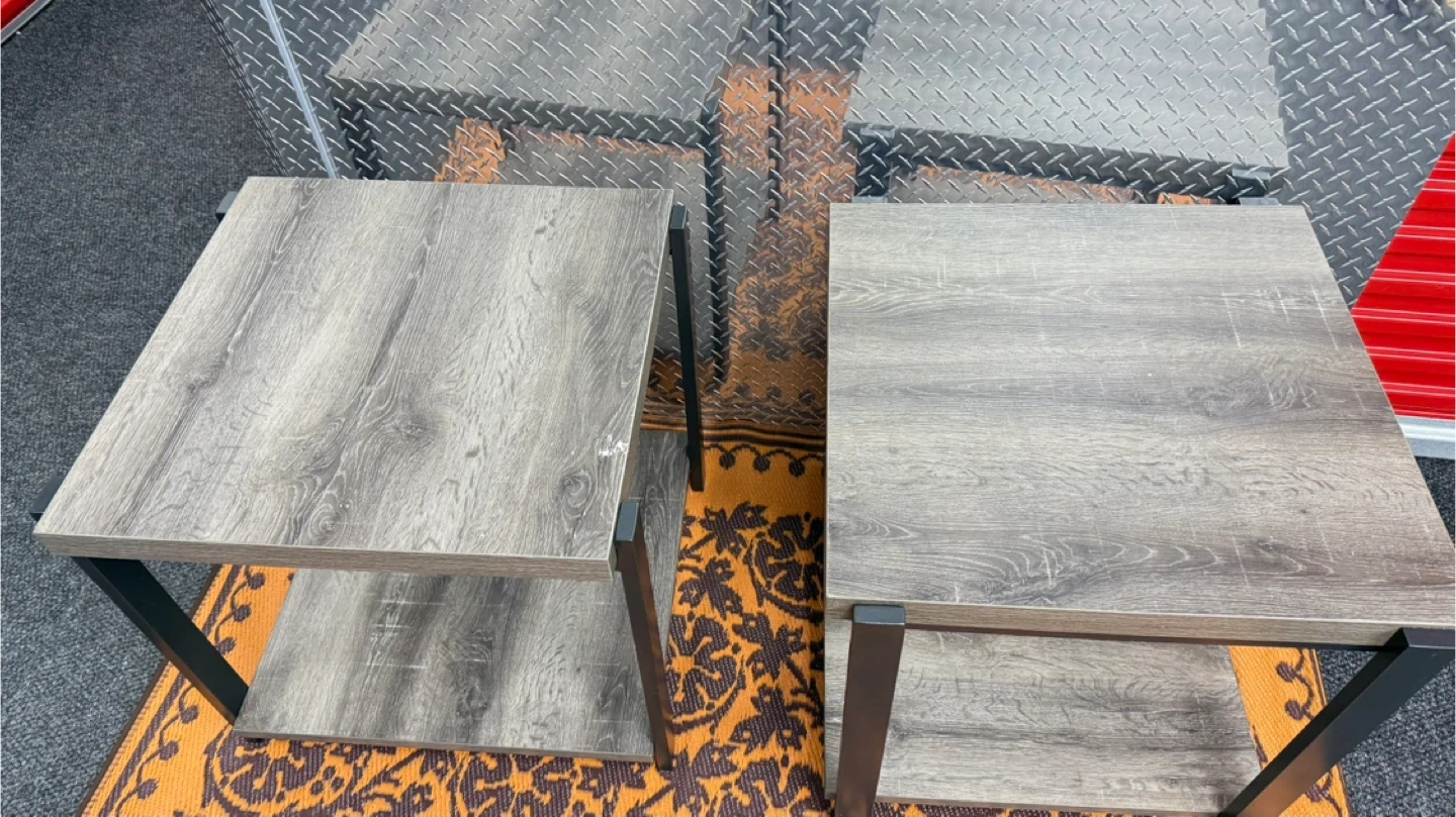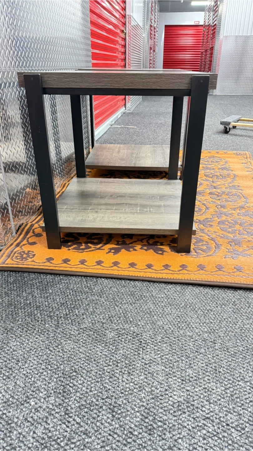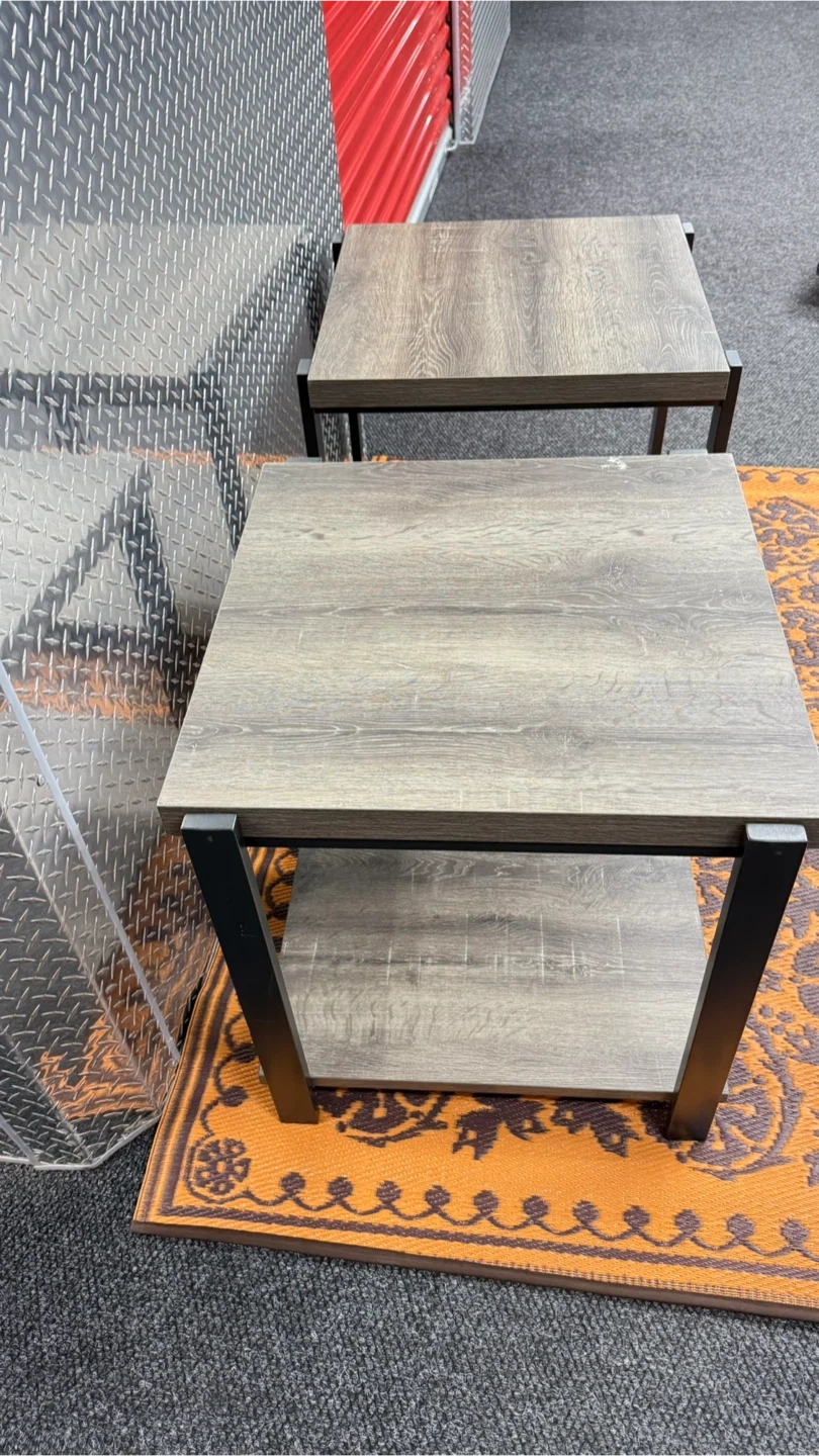 Selling a set of two modern end tables. Each table features a wood grain laminate top and shelf with a sturdy black metal frame. They're perfect for a living room