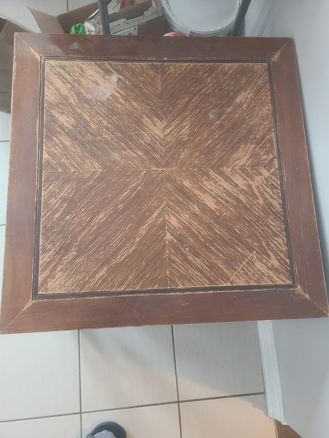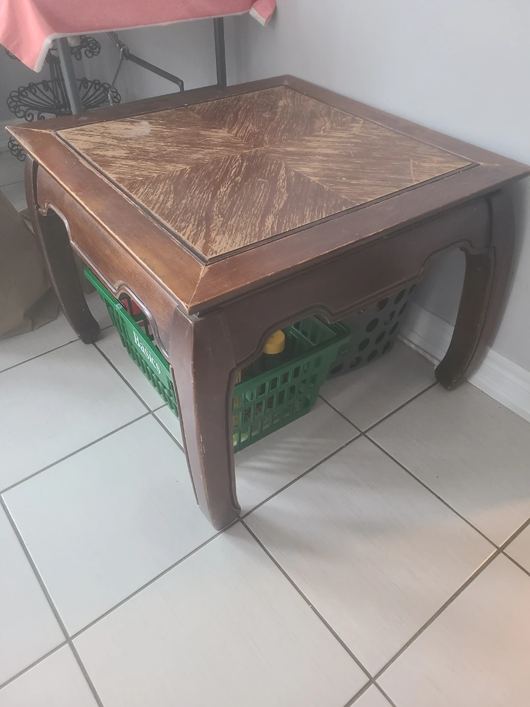 Selling a brown wood side table. It's got a unique design on top and a sturdy build. Perfect for adding a touch of warmth to your living space! Can be used as tea table.