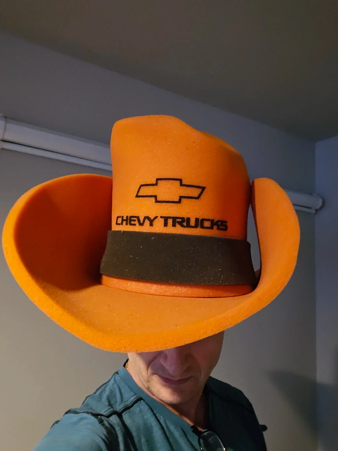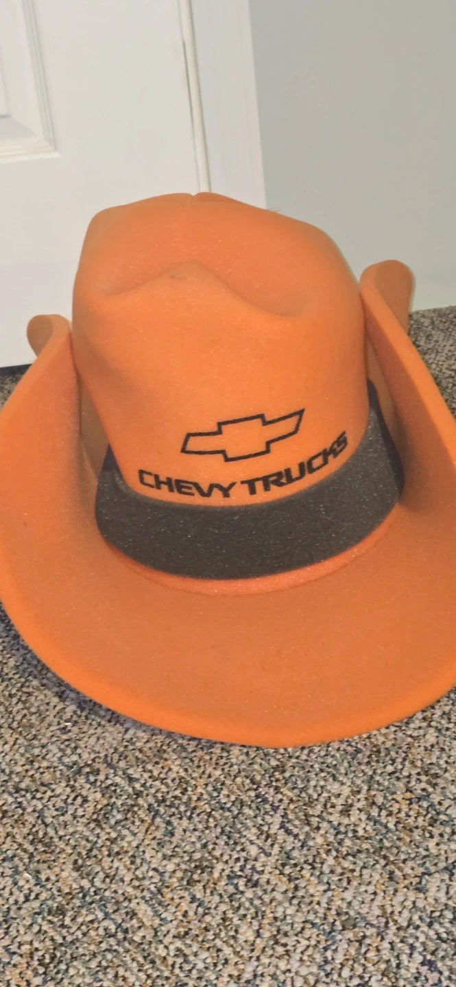 Giant foam cowboy hat with the Chevy Trucks logo on it. It has a grey band around the base of the crown.