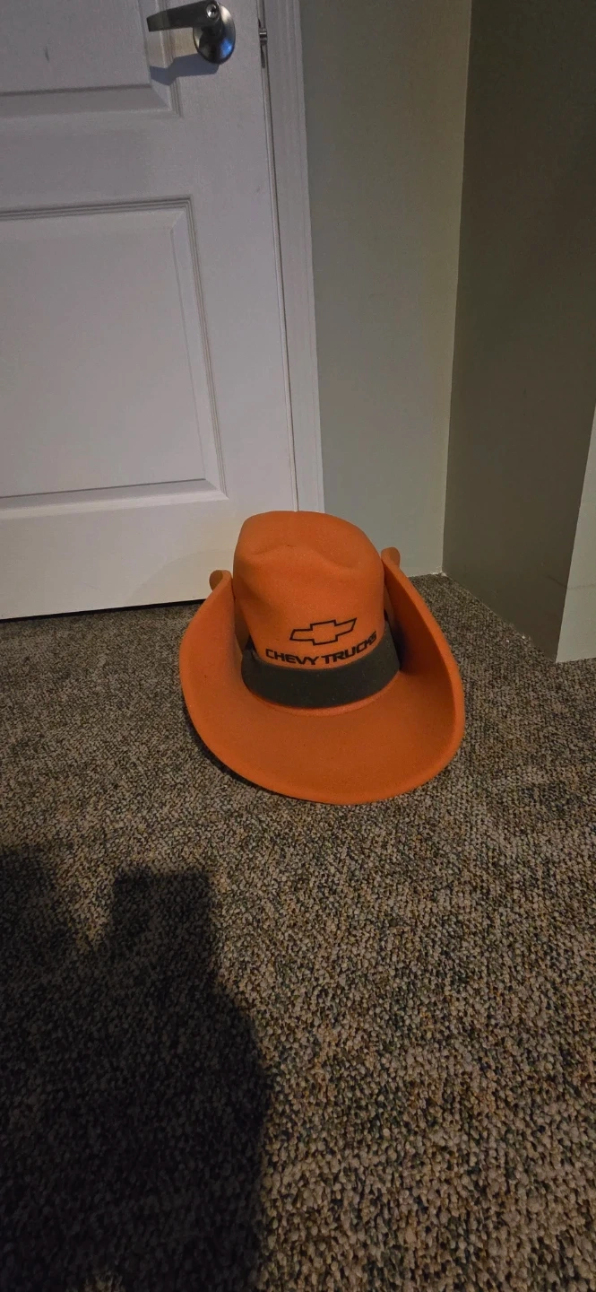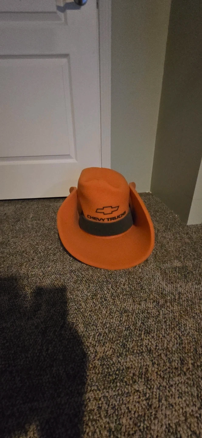 Giant foam cowboy hat with the Chevy Trucks logo on it. It has a grey band around the base of the crown.