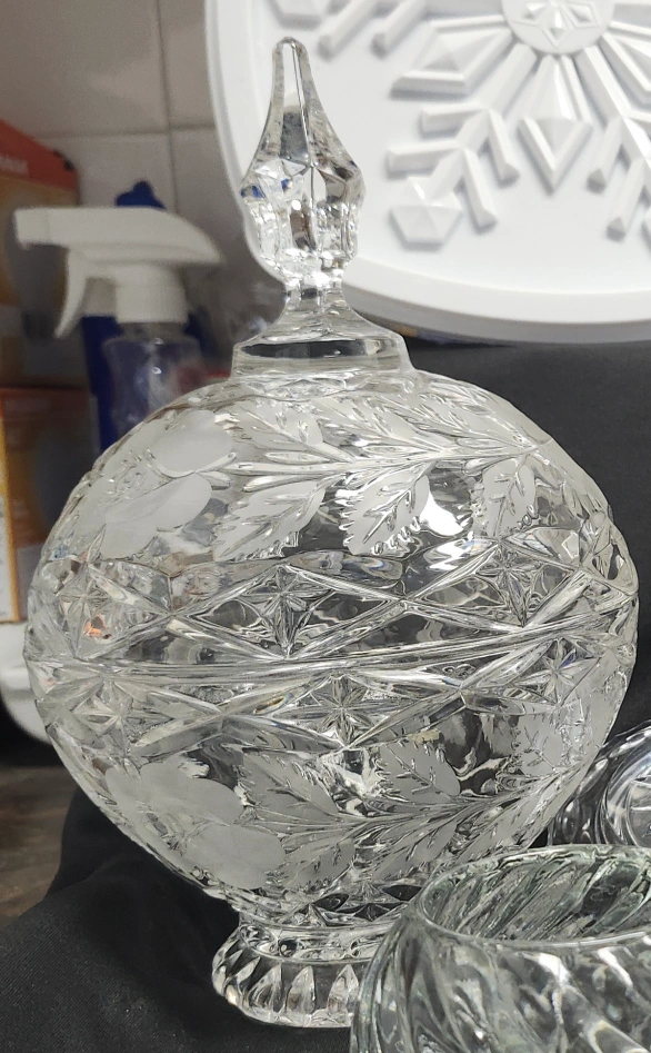 Beautiful etched crystal candy dish.