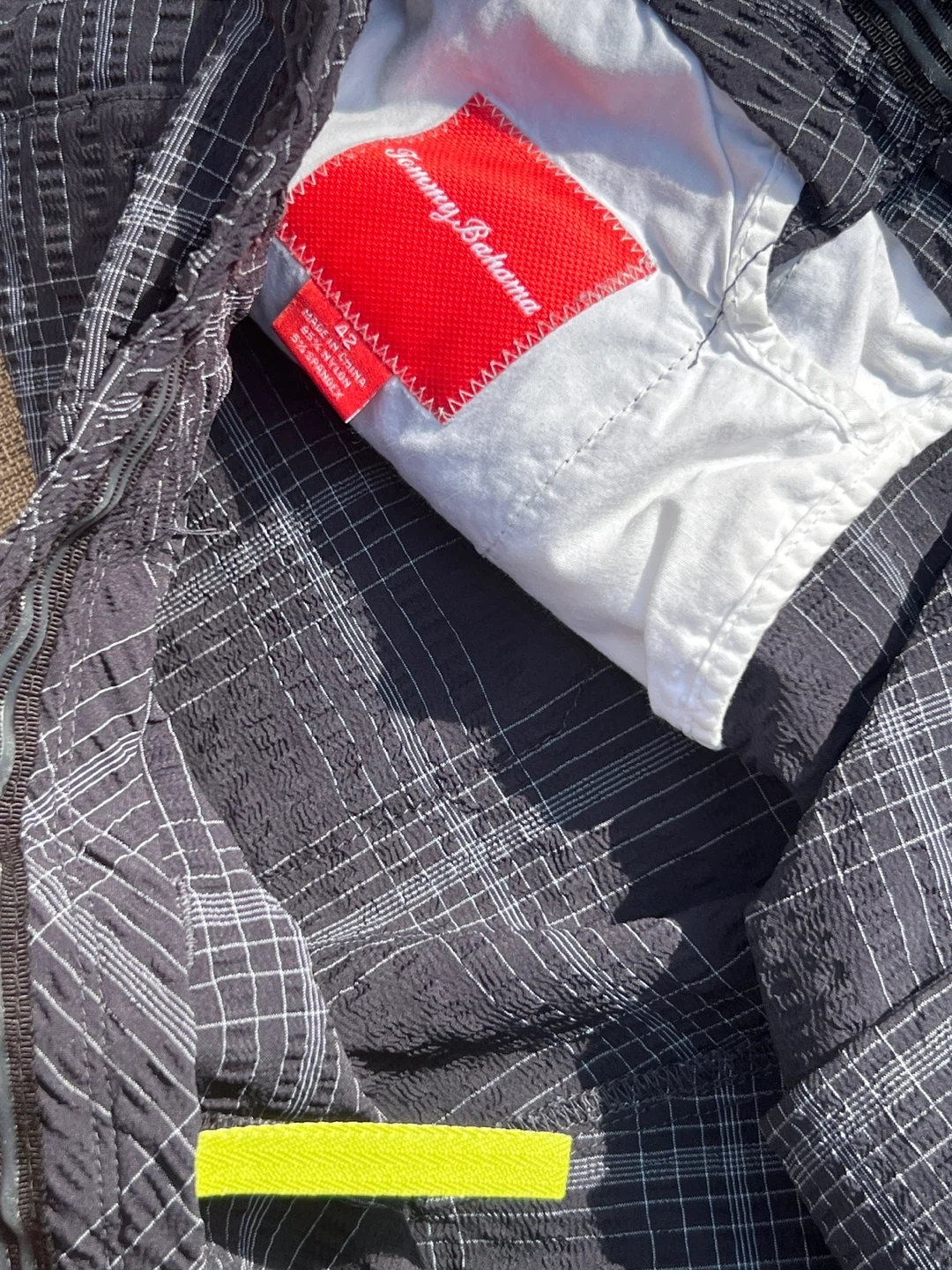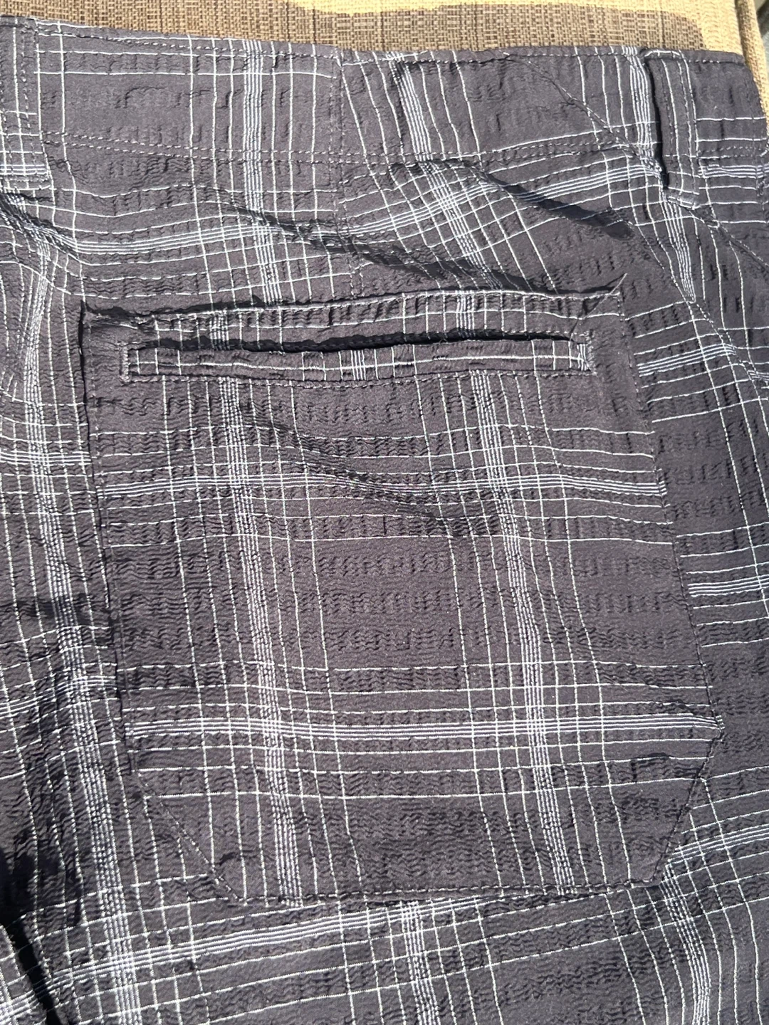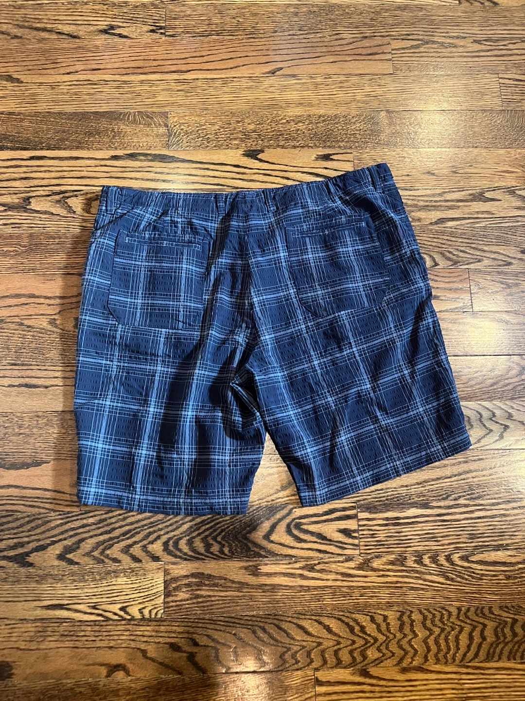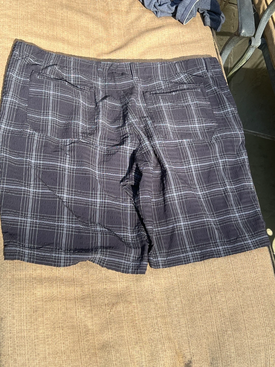 Tommy Bahama swim trunks with a plaid pattern. Made with 92% nylon and 8% spandex. Features a back pocket with a button closure. These are great for a day at the beach or pool! Lightweight plaid shorts with crisp white or gray grid lines on black or blue fabric. In the sun sometimes looks blue or gray and in the shadow can look black or gray. I took many pictures to get the true color depending on the lighting. Elastic waistband. Casual, breathable design for warm days. Two back pockets and two double front pockets. Measurements. Waste 44 inch front rise 12 inch. Inner leg length 12 inch leg opening 12.5 inch.