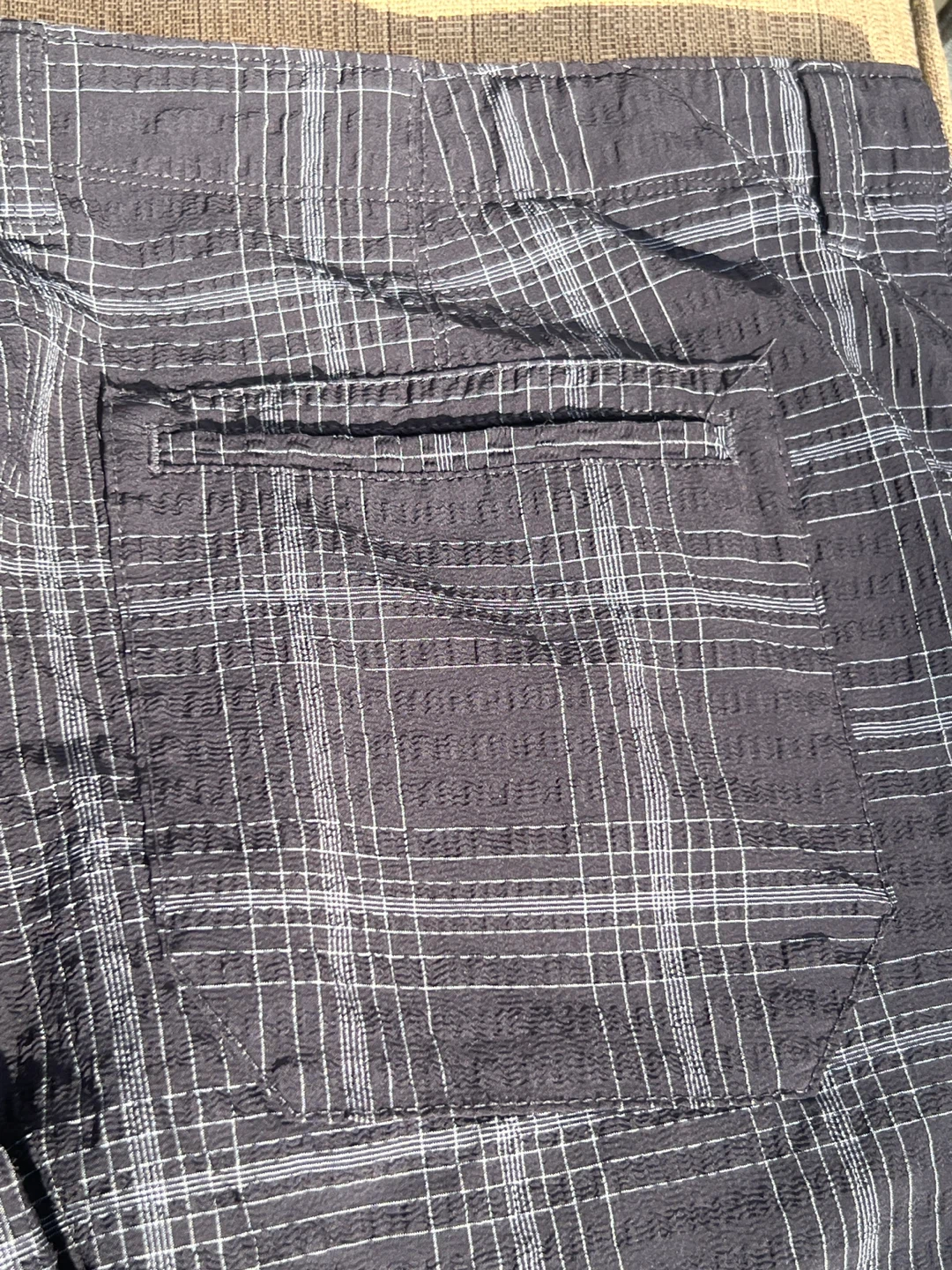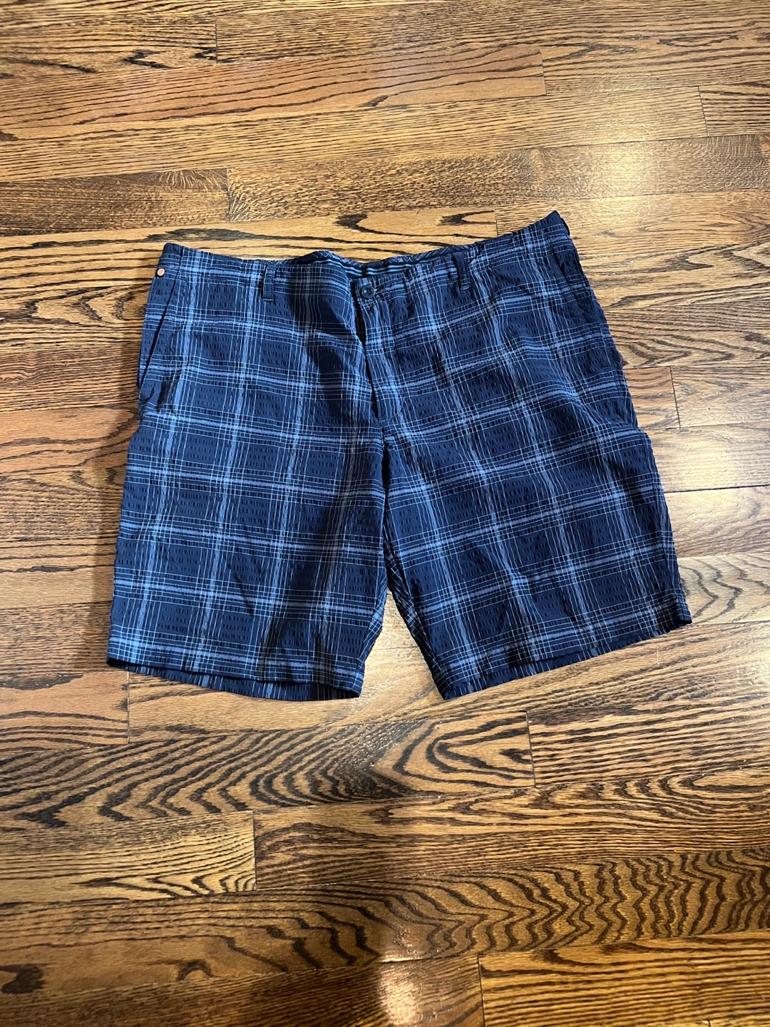 Tommy Bahama swim trunks with a plaid pattern. Made with 92% nylon and 8% spandex. Features a back pocket with a button closure. These are great for a day at the beach or pool! Lightweight plaid shorts with crisp white or gray grid lines on black or blue fabric. In the sun sometimes looks blue or gray and in the shadow can look black or gray. I took many pictures to get the true color depending on the lighting. Elastic waistband. Casual, breathable design for warm days. Two back pockets and two double front pockets. Measurements. Waste 44 inch front rise 12 inch. Inner leg length 12 inch leg opening 12.5 inch.