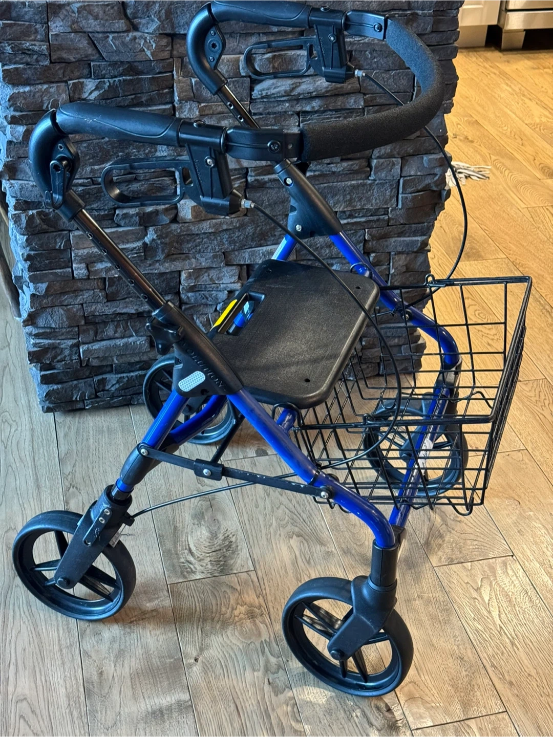 ONLY $195. EVOLUTION PIPER MINI FOLDABLE WALKER …holds up to 275 lbs…handle height adjustable …removable basket with handle …blue …in great condition…solid seat