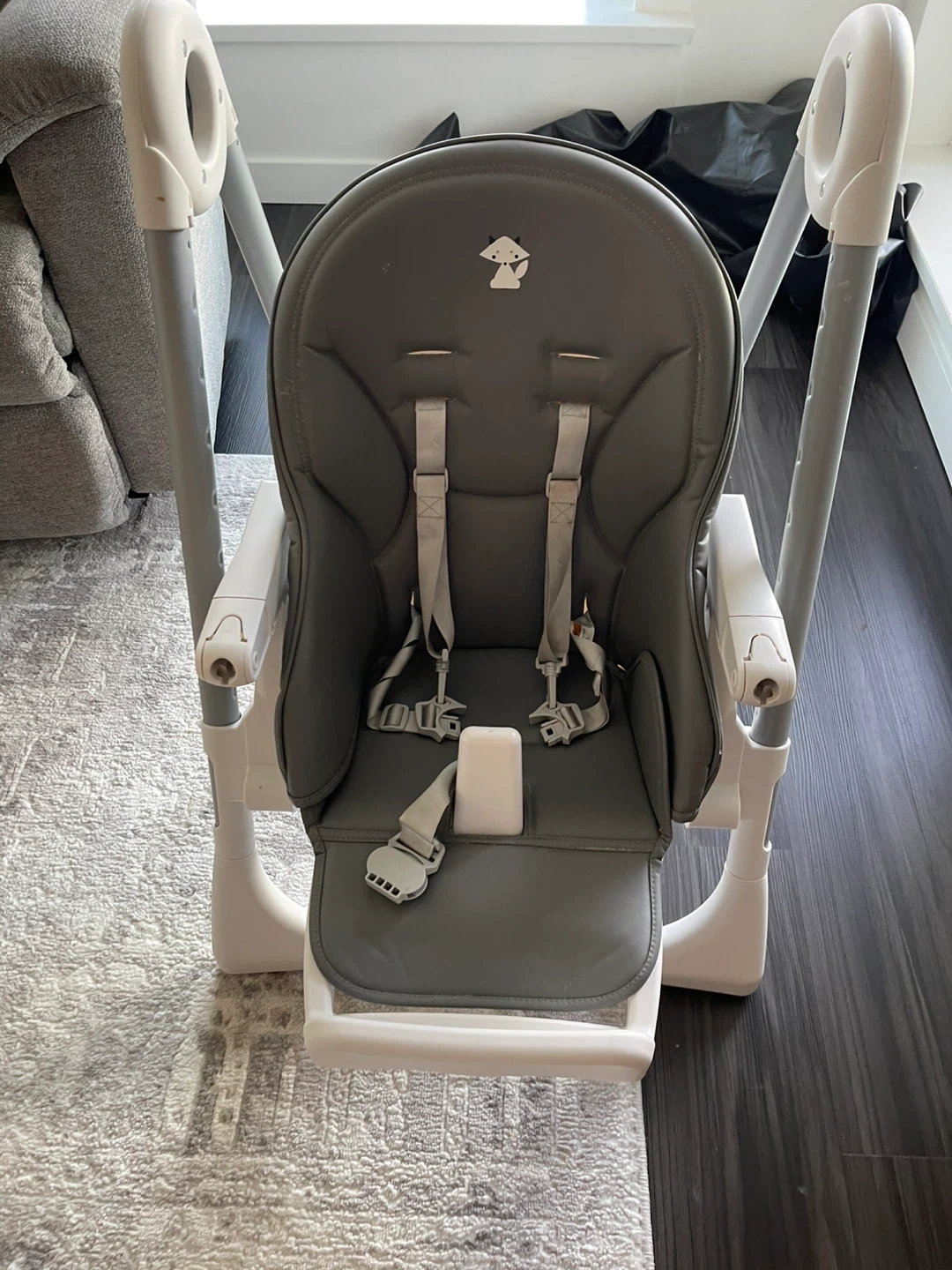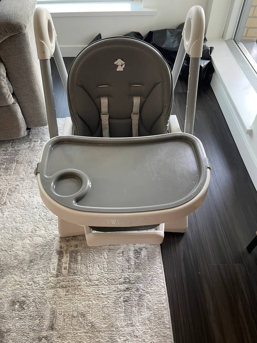This is a SwellFoX baby high chair. It has a padded seat and a tray. The tray is removable for easy cleaning. It includes a 5-point harness for safety. This chair is suitable for babies and toddlers.