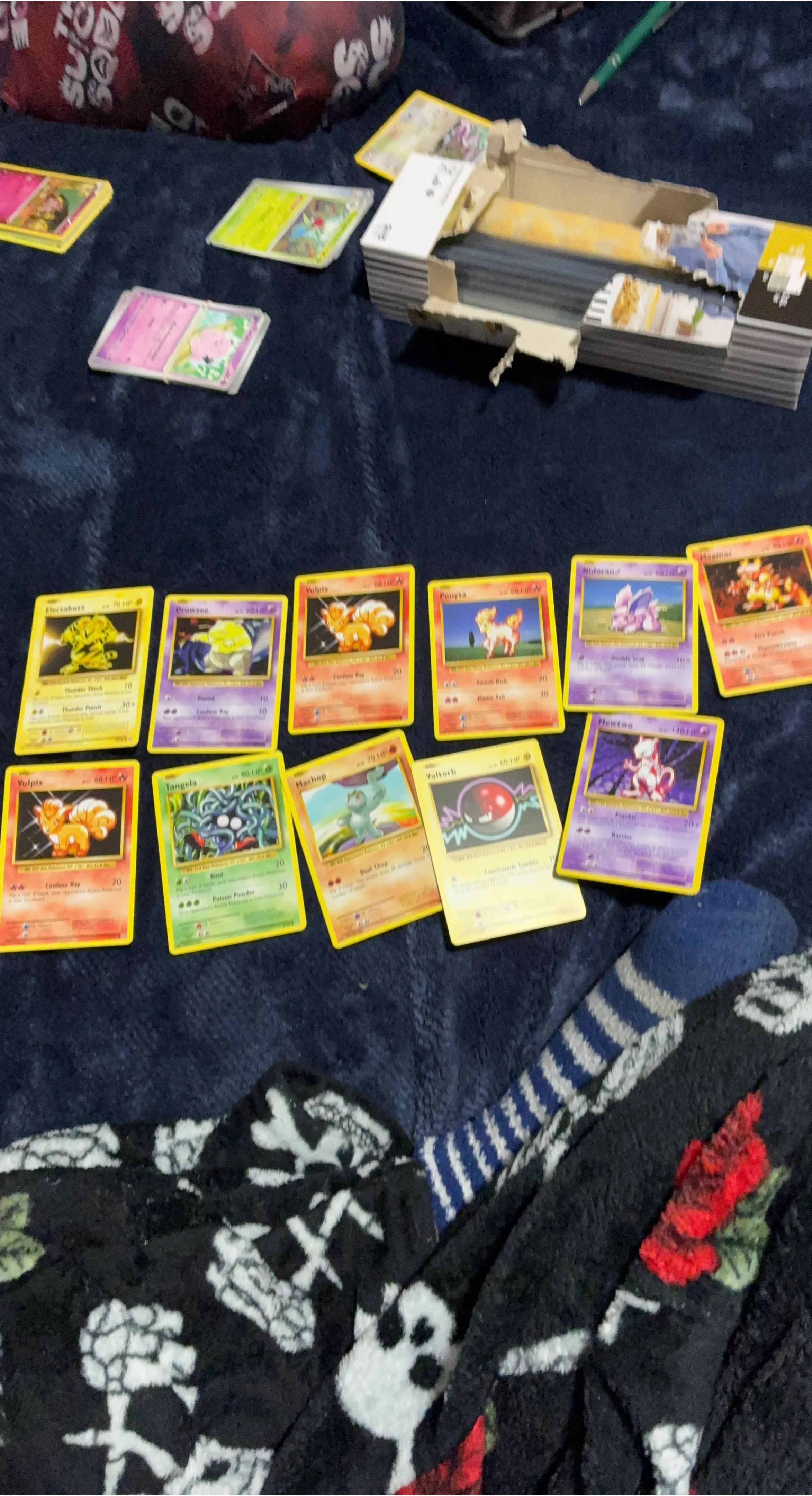 Collection of various Pokemon trading cards including Vulpix, Electabuzz, Drowzee, Tangela, Machop, Nidoran, Ponyta, and Mewtwo. Cards are from the Pokemon trading card game. These are collectible cards for fans and players.