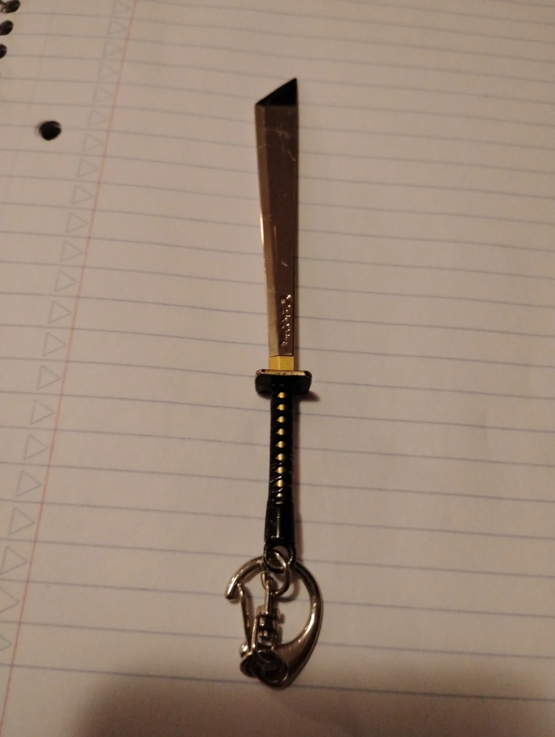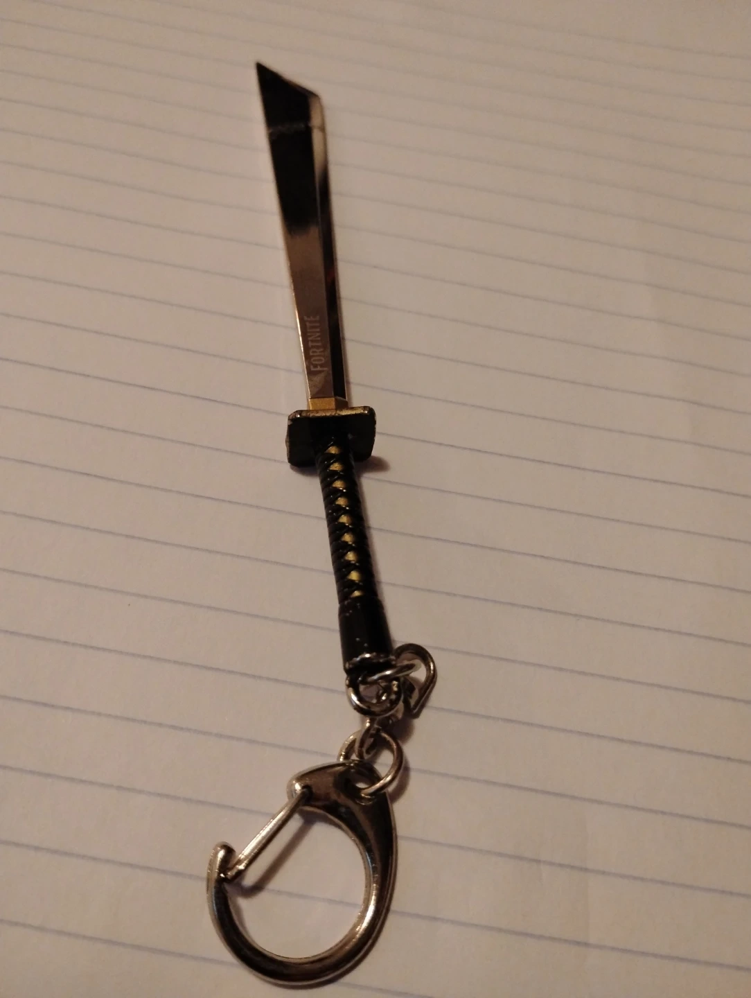 This is a Fortnite Dual Katana keychain. It features a gold-coloured blade with black handle detail. Includes a keyring and a clip for attachment.