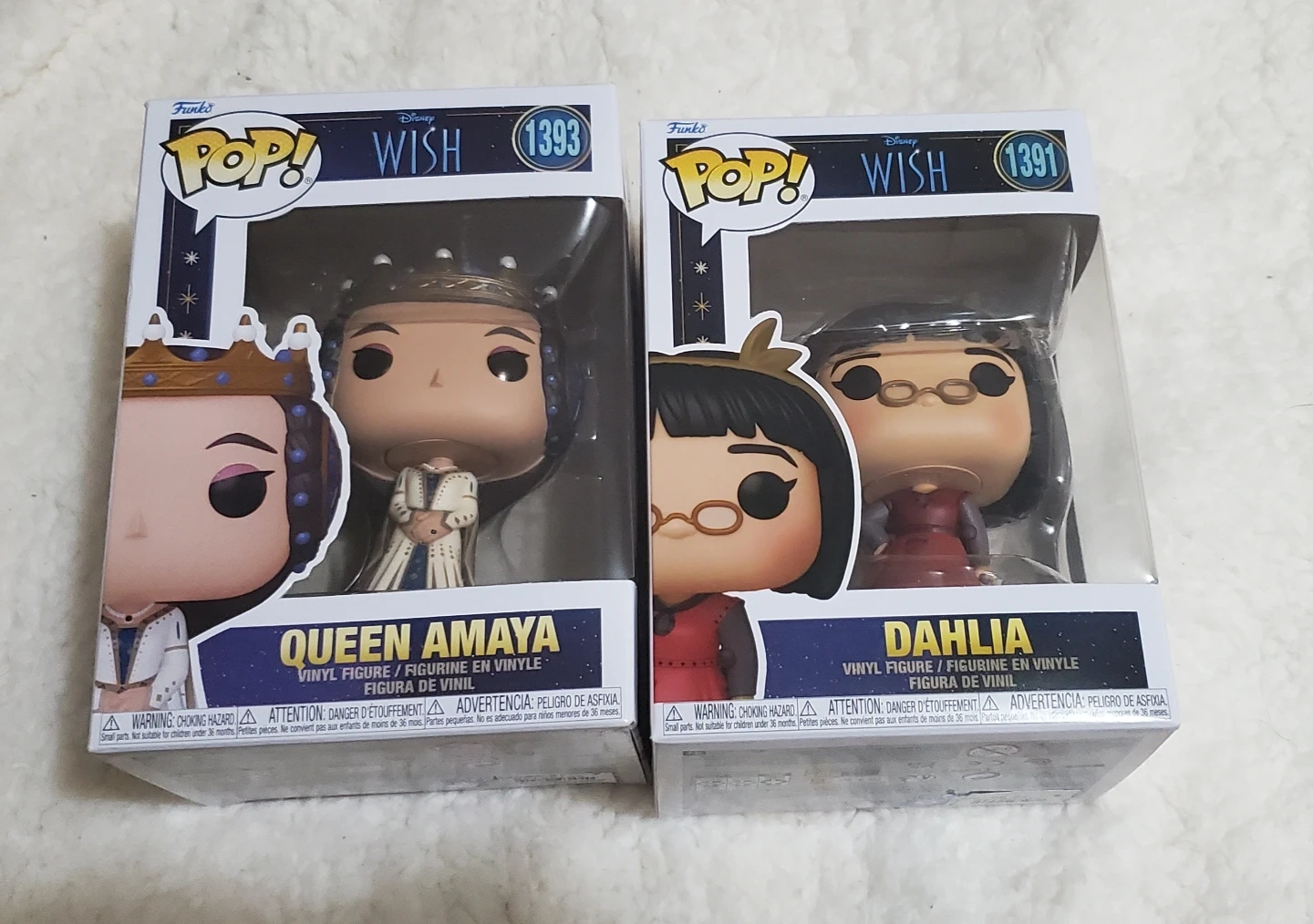 Two Funko Pop! vinyl figures from Disney's Wish. Includes Queen Amaya and Dahlia. Figures are in original packaging.