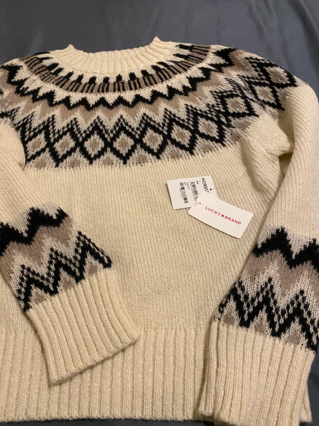 Cozy up in this Lucky Brand cream-colored sweater! It features a unique patterned design in black, brown, and white tones. Perfect for adding a touch of style to your wardrobe