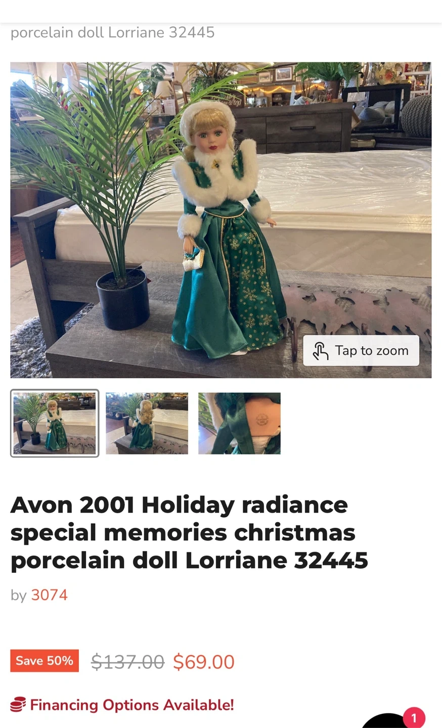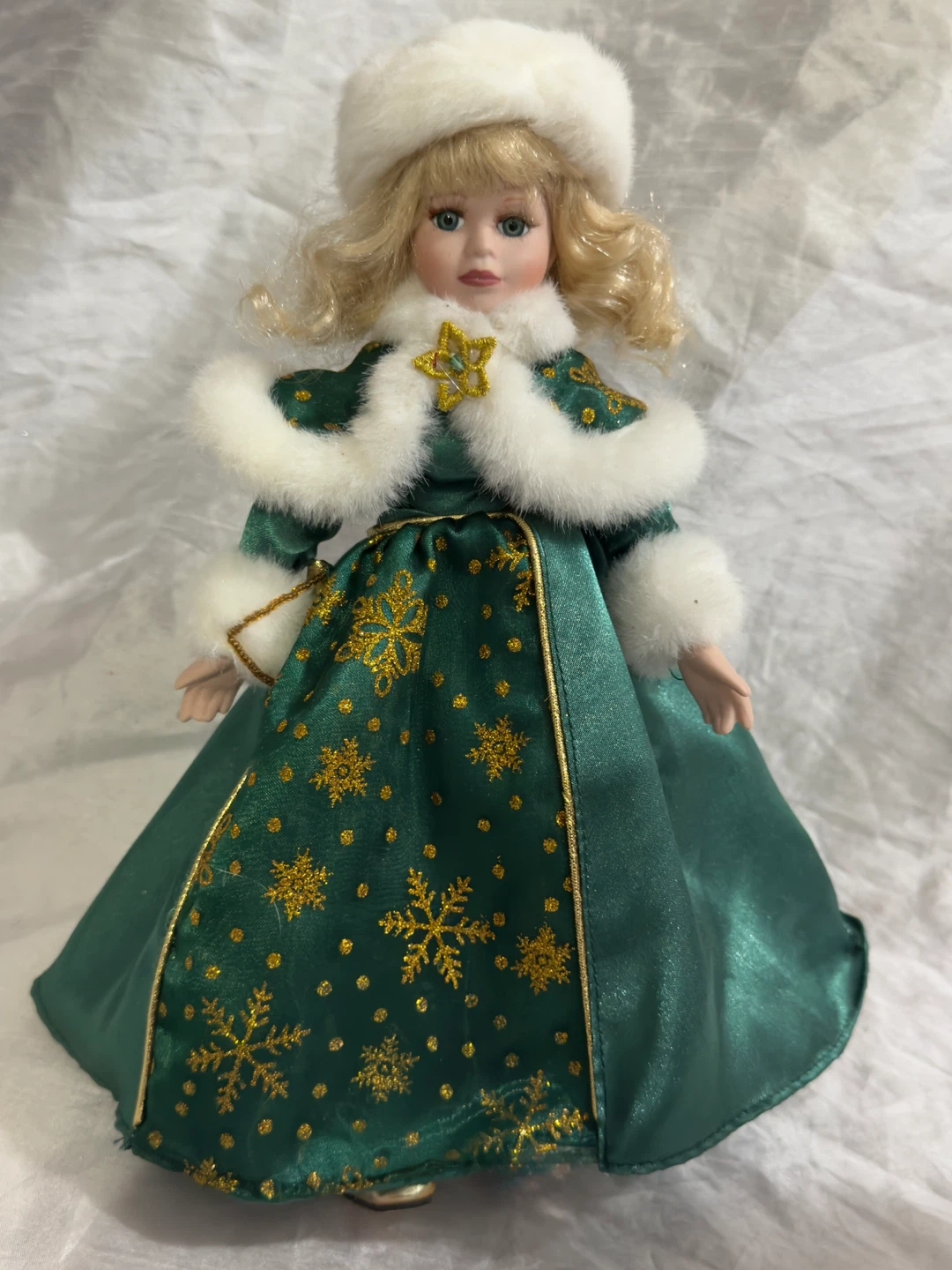 This is the Avon 2001 Holiday Radiance Special Memories Christmas porcelain doll Lorriane. She's dressed in a beautiful green satin gown with gold snowflake accents and a white fur-trimmed cape and hat. It's a lovely collectible piece for the holidays!