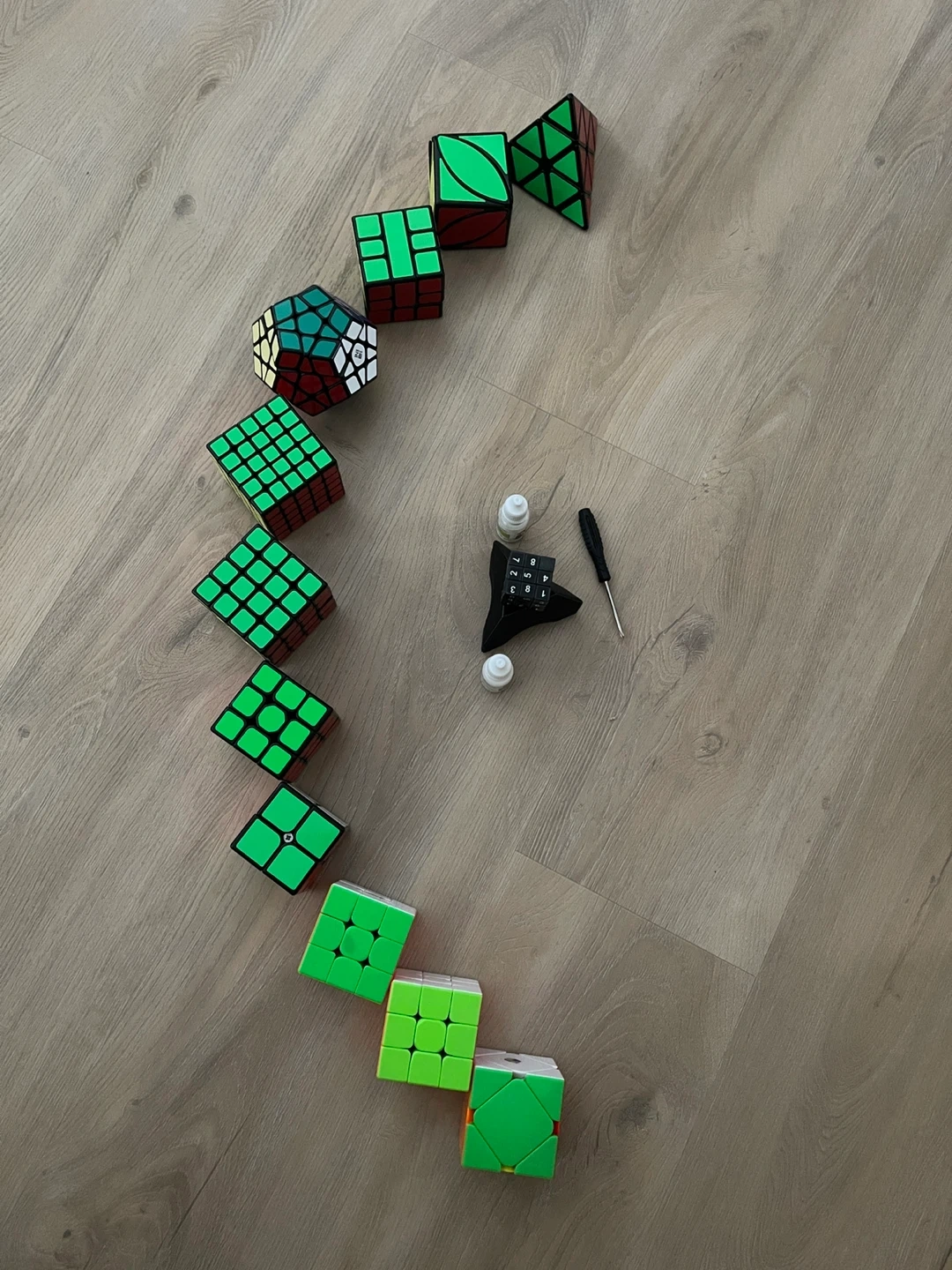 Selling a collection of Rubik's cubes in various shapes and sizes. Great for puzzle enthusiasts and collectors! Includes three 3x3s, 2x2, 4x4, 5x5, megaminx, pyraminx, ivy cube, square one, and a scube.