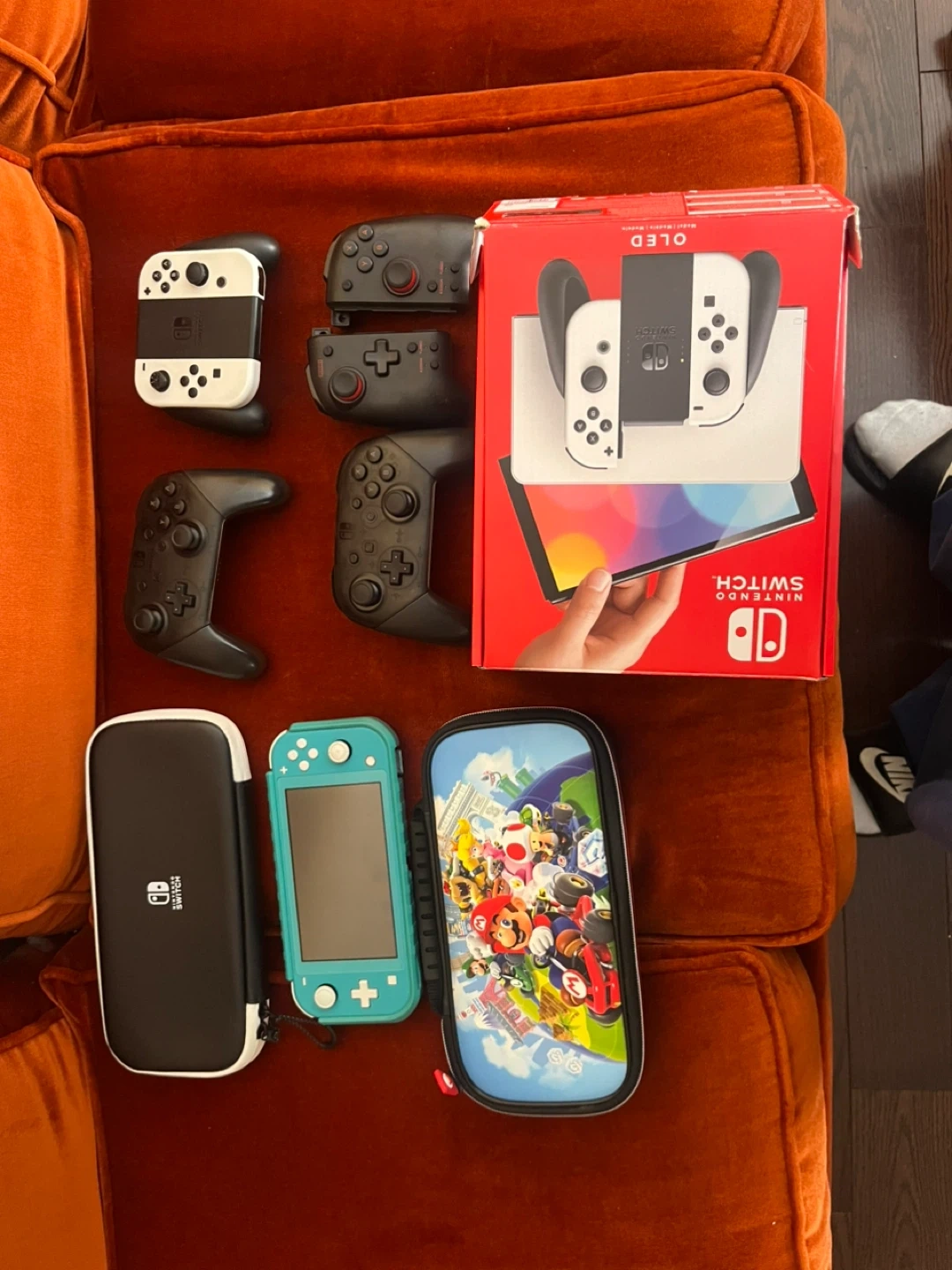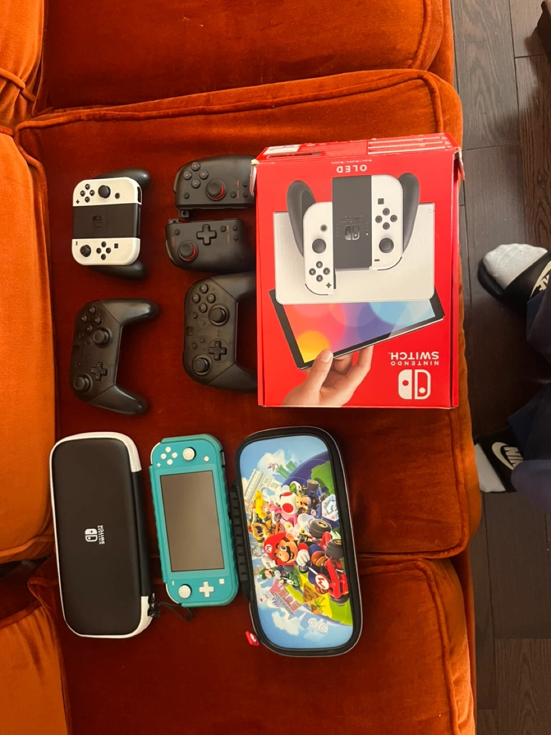 Selling a Nintendo Switch OLED Model console with several accessories + Turquoise Switch Lite for parts my son dropped it in the airport and has just been sitting on shelf. OLED Switch working fine and works great no scratches and screen still looks new. It's the white model and includes Joy-Cons, additional controllers as shown and two official Nintendo carrying cases. Perfect for gaming on the go or at home!