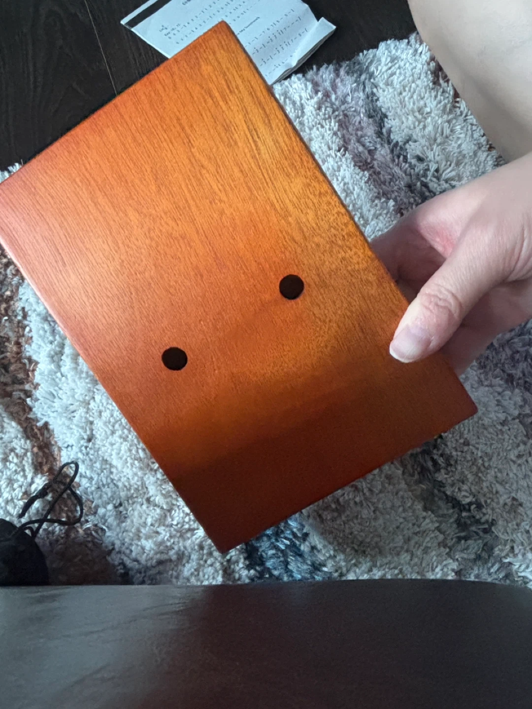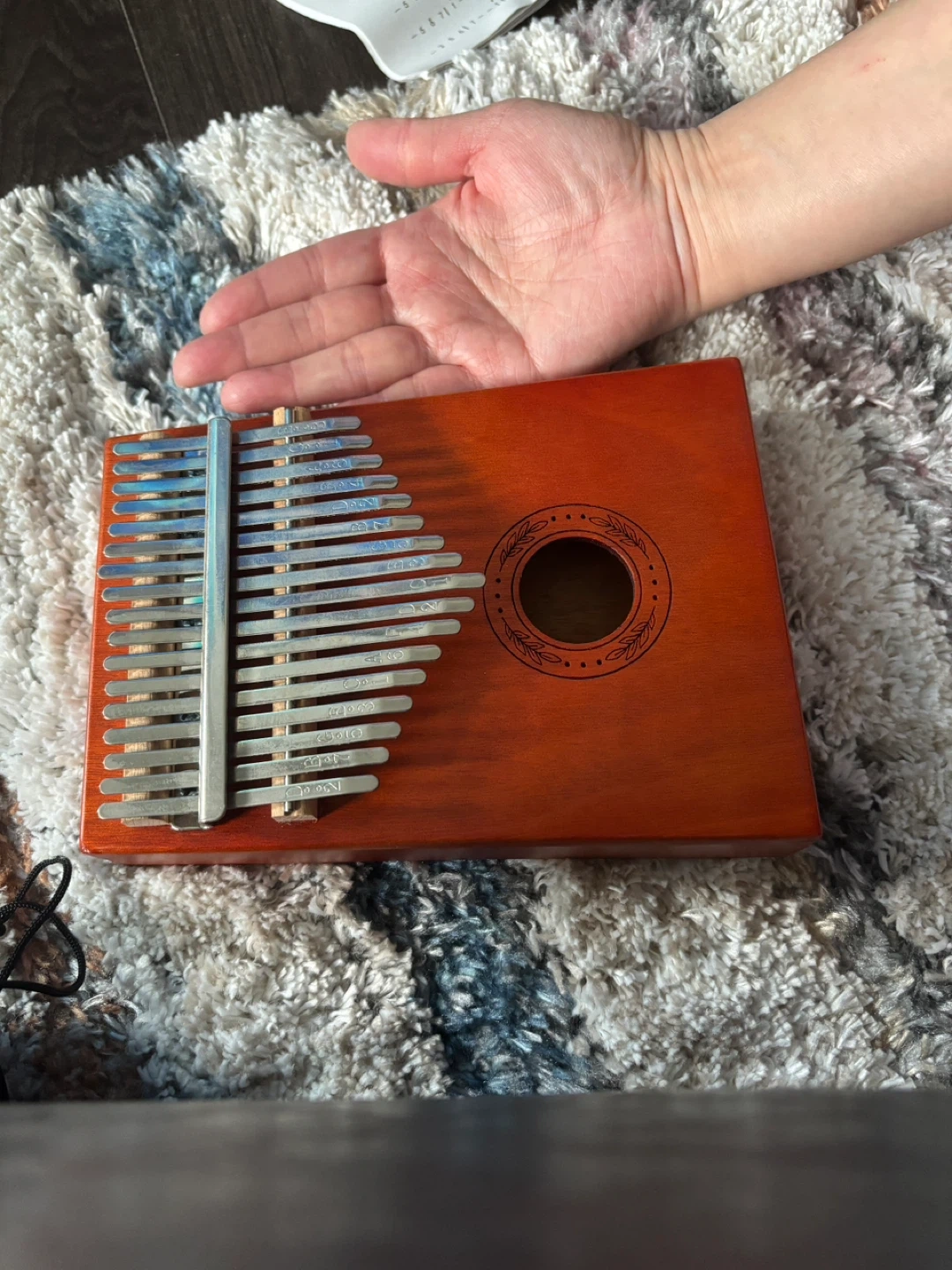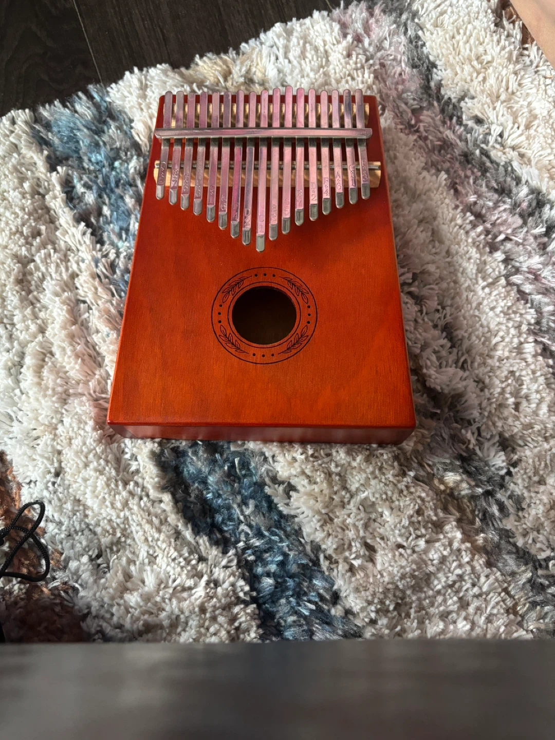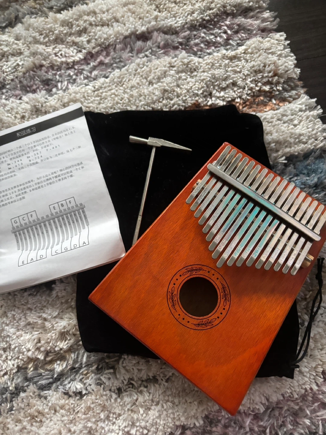 Wooden Kalimba thumb piano with 17 metal keys. Includes a tuning hammer and instruction booklet. Great for learning to play music!
