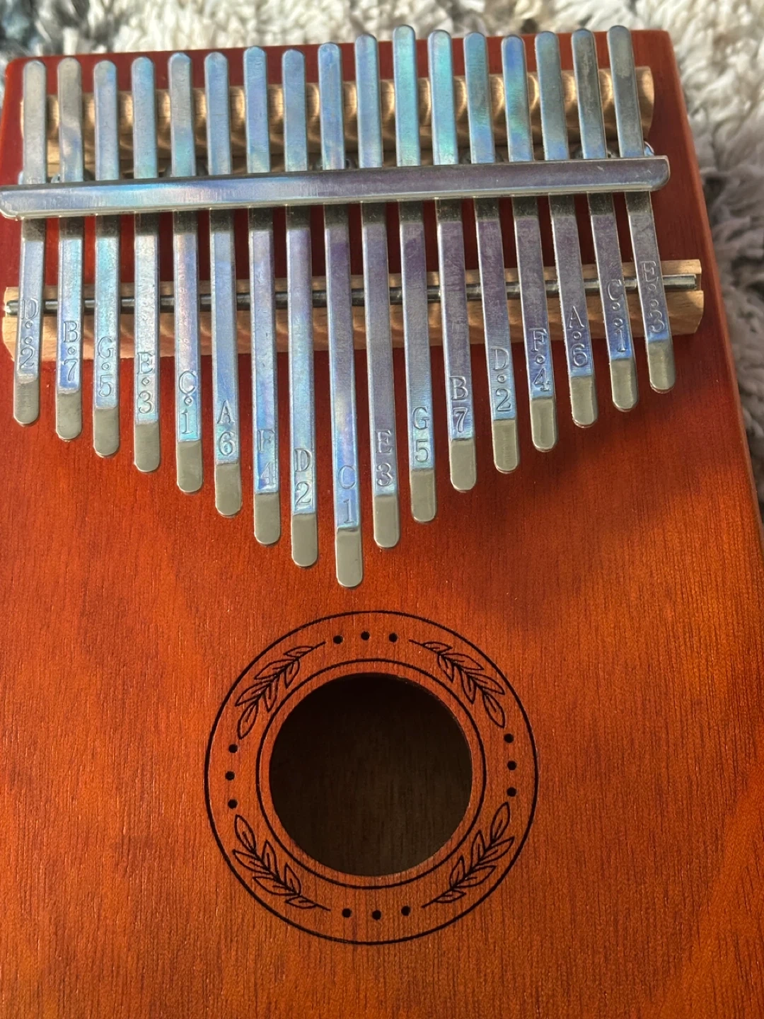 Wooden Kalimba thumb piano with 17 metal keys. Includes a tuning hammer and instruction booklet. Great for learning to play music!