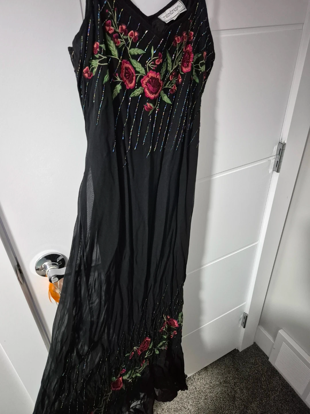 This is a beautiful black dress from Raindrops! It features lovely floral embroidery. Perfect for a night out or a special occasion