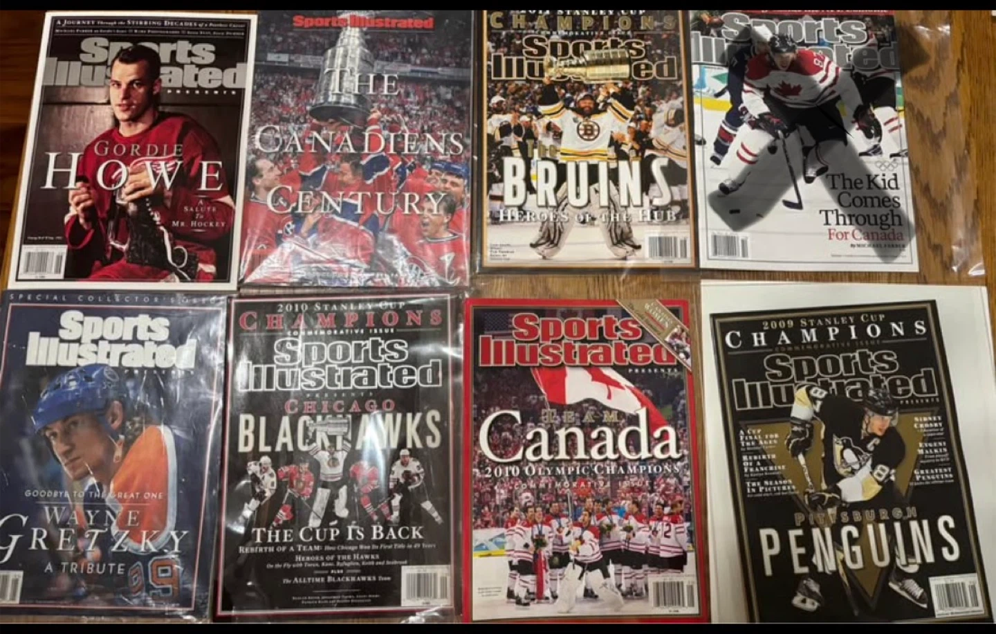 This is a collection of assorted hockey magazines, including The Hockey News and Sports Illustrated. Issues cover various Stanley Cup wins and notable players. These publications are perfect for any dedicated hockey fan wanting to revisit past seasons and celebrate iconic moments.
