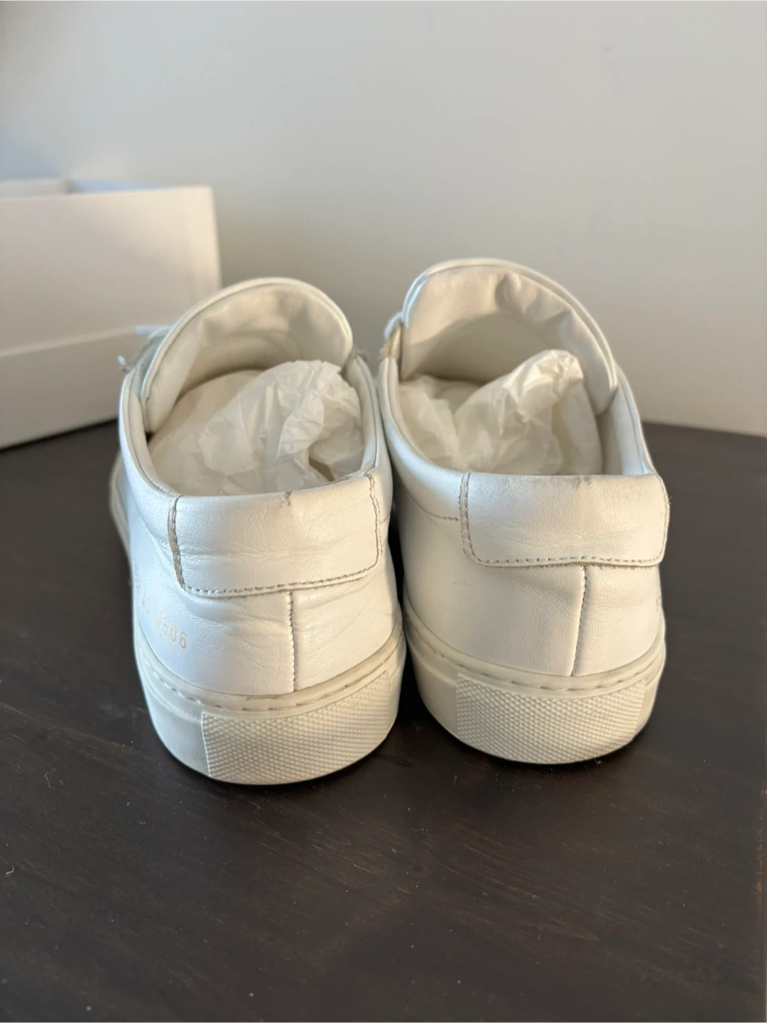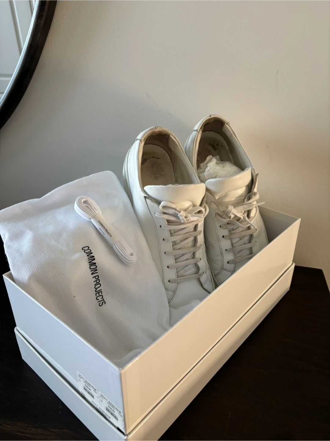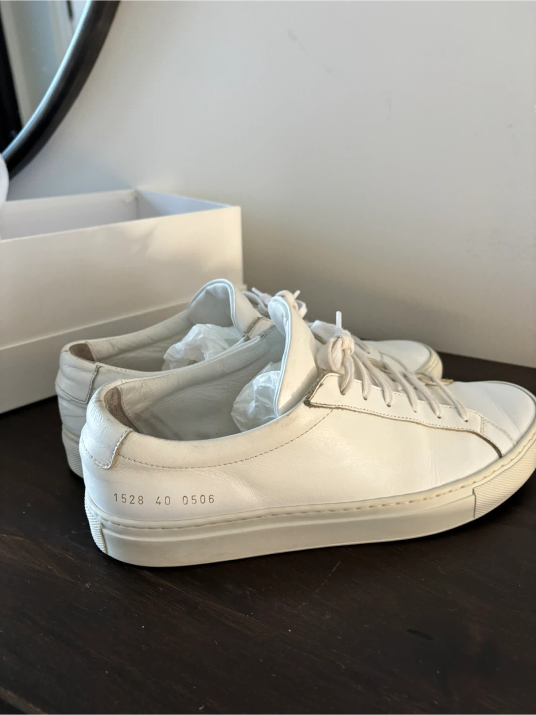 Common Projects Achilles Low sneakers in white leather. These are a size 40, EU. They come with the original box and dust bag. They're classic, clean sneakers.