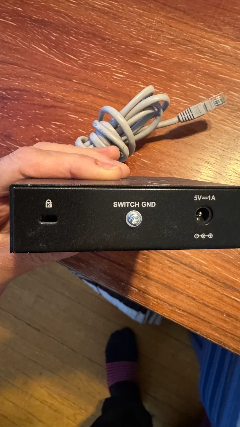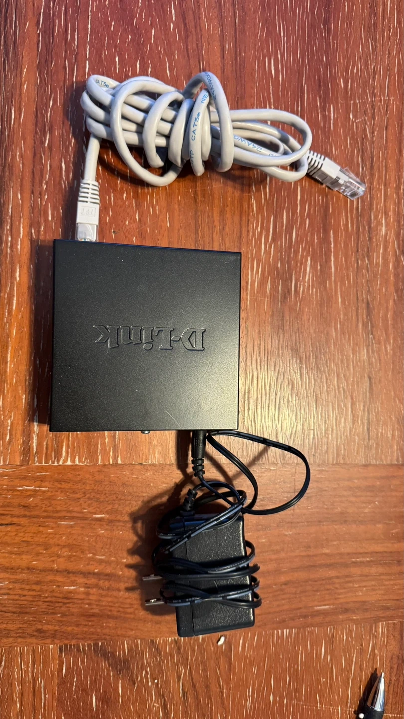 This is a D-Link DGS-105 5-port Gigabit network switch. It includes a power adapter and an Ethernet cable. The switch has 10/100M and 1000M ports for flexible connectivity. It's a handy device for expanding your home or office network!