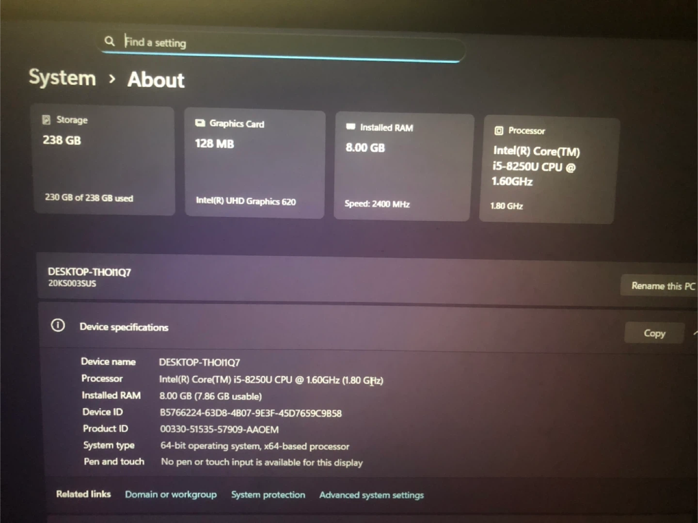 This black Lenovo ThinkPad laptop comes with an Intel Core i5-8250U processor and 8 GB of RAM. It has 238 GB of storage and Intel UHD Graphics 620. The charger is included.