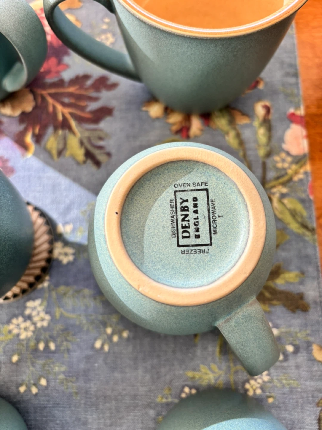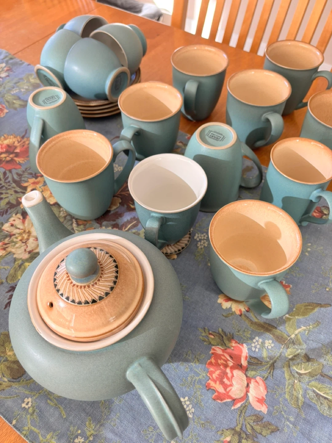 This is a Denby Luxor tea pot with 4 tea cups + saucers, and coffee mugs(11)perfect for enjoying a warm beverage. It's dishwasher, microwave, oven, and freezer safe. The set includes a teapot and multiple cups. Chip free.