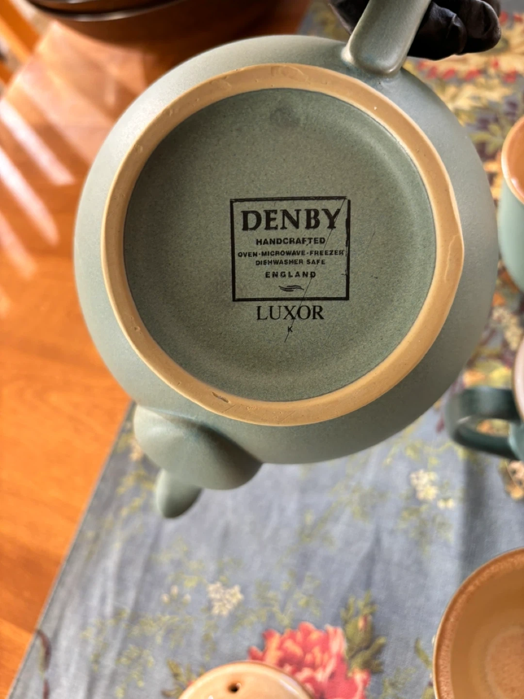This is a Denby Luxor tea pot with 4 tea cups + saucers, and coffee mugs(11)perfect for enjoying a warm beverage. It's dishwasher, microwave, oven, and freezer safe. The set includes a teapot and multiple cups. Chip free.