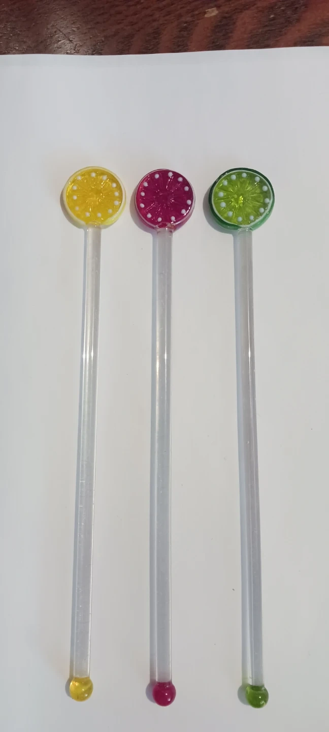 New !! These colorful glass Martini/drinks stirrers feature colorful fruit slice designs. Each stirrer has a colorful glass stick topped with a round disc. Comes in yellow, pink, and green.