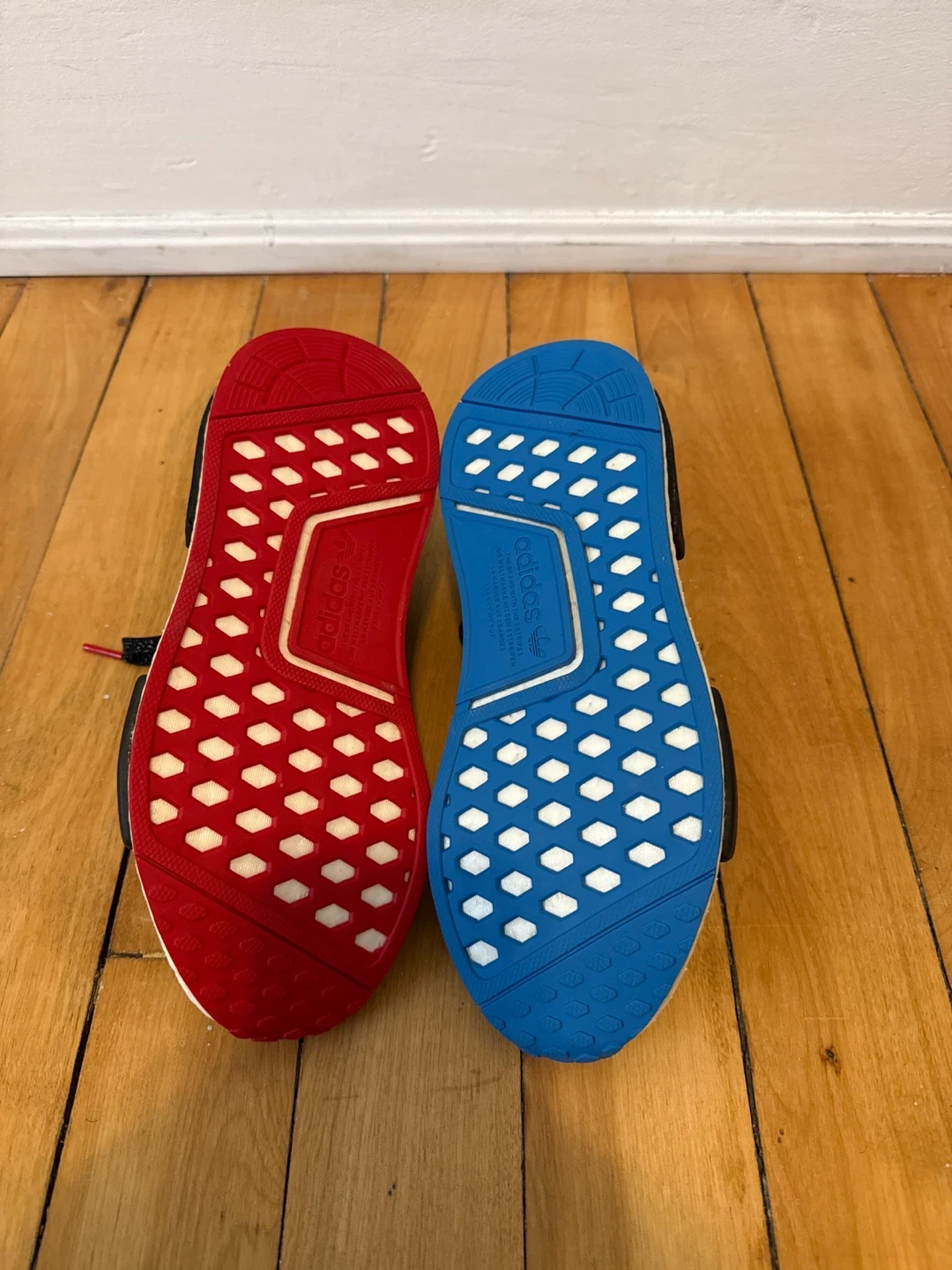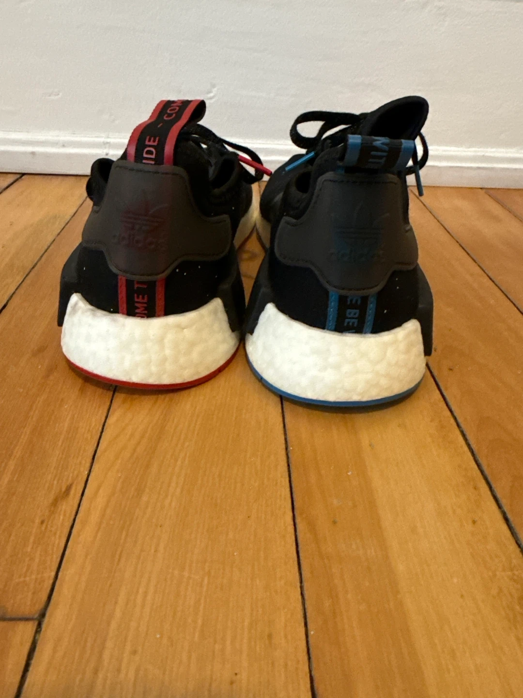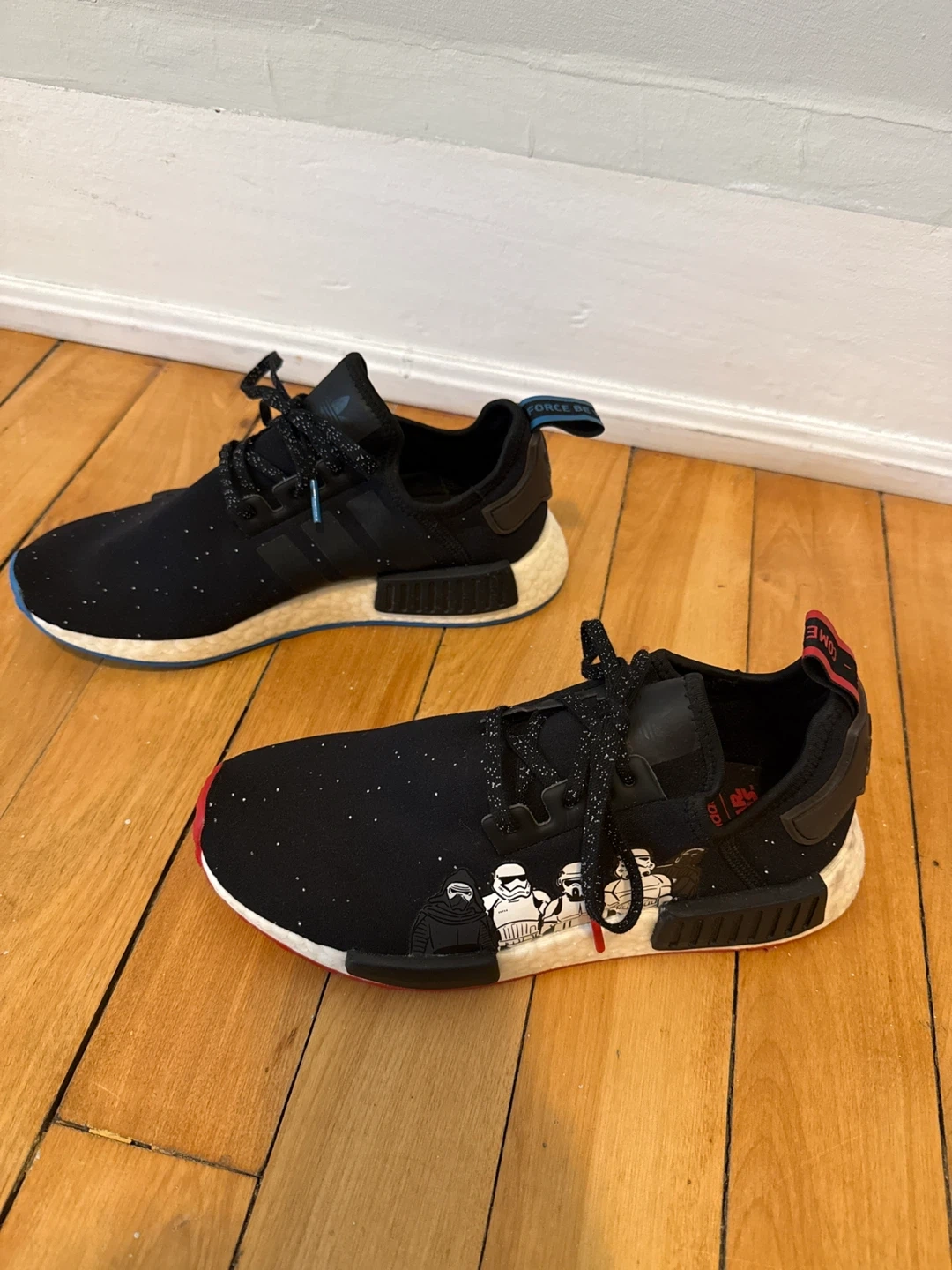 Adidas NMD R1 sneakers aStar Wars collab. Black knit upper with speckled detailing and character graphics. Boost midsole for comfort. Rubber outsoles. Never worn but there is some dye transfer on the back of the left shoes.