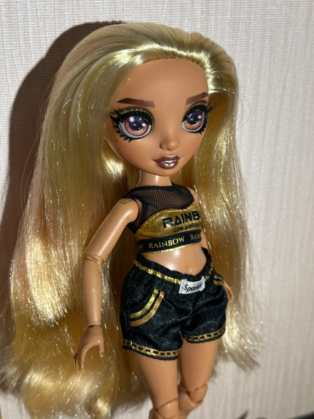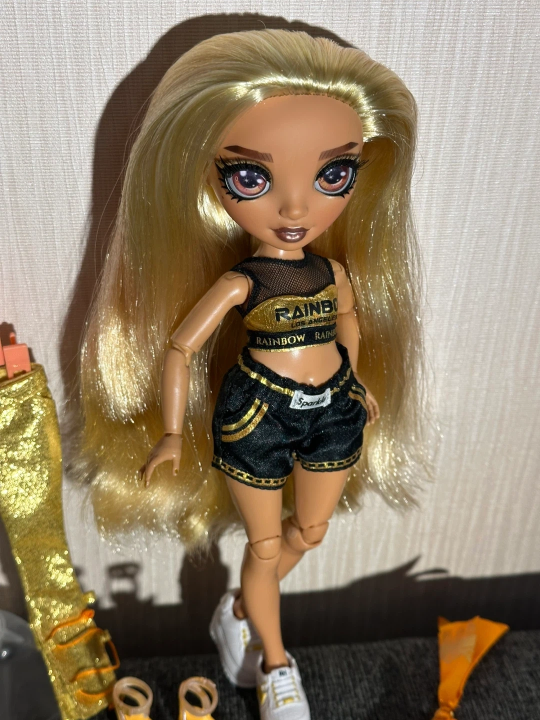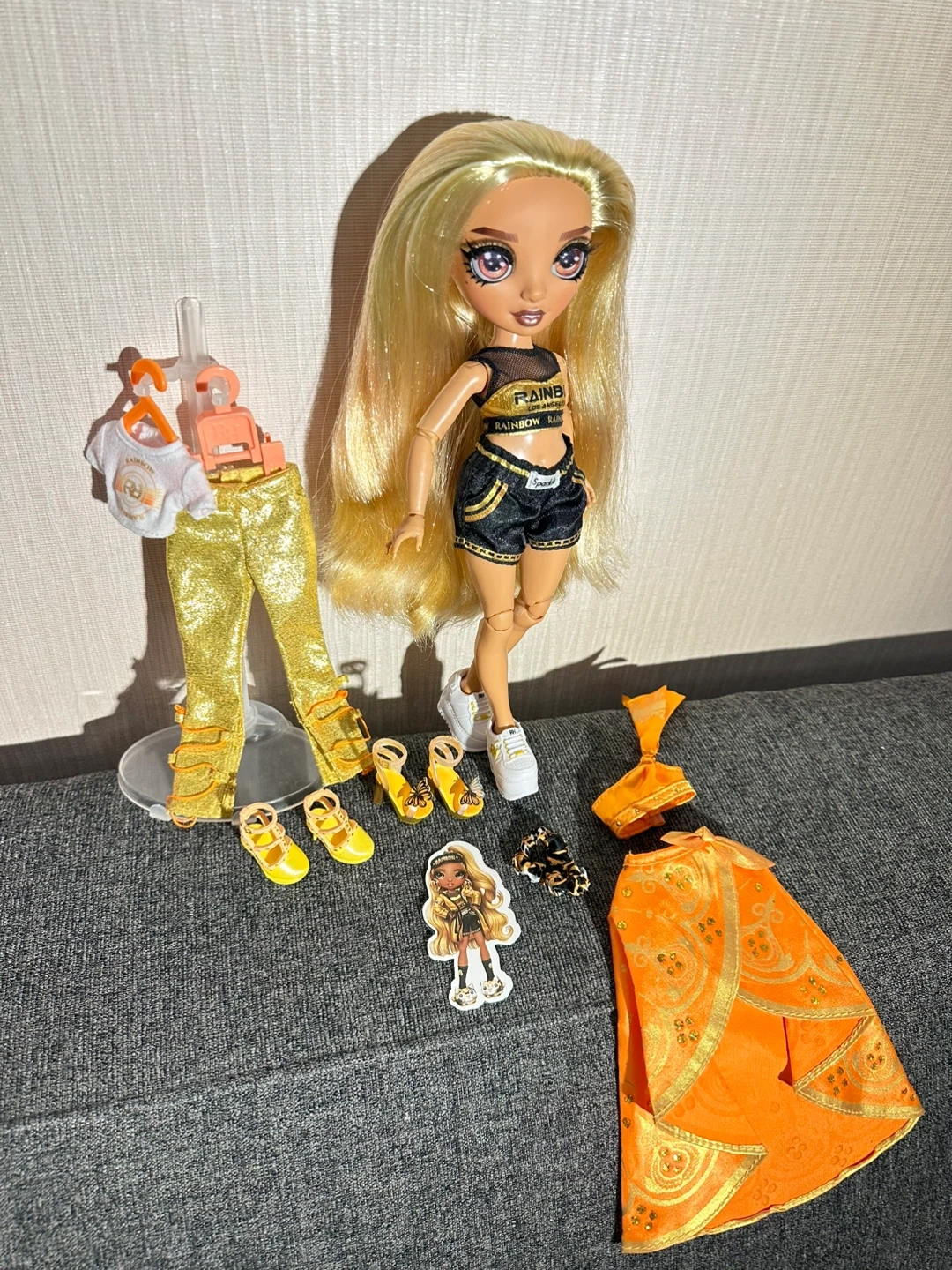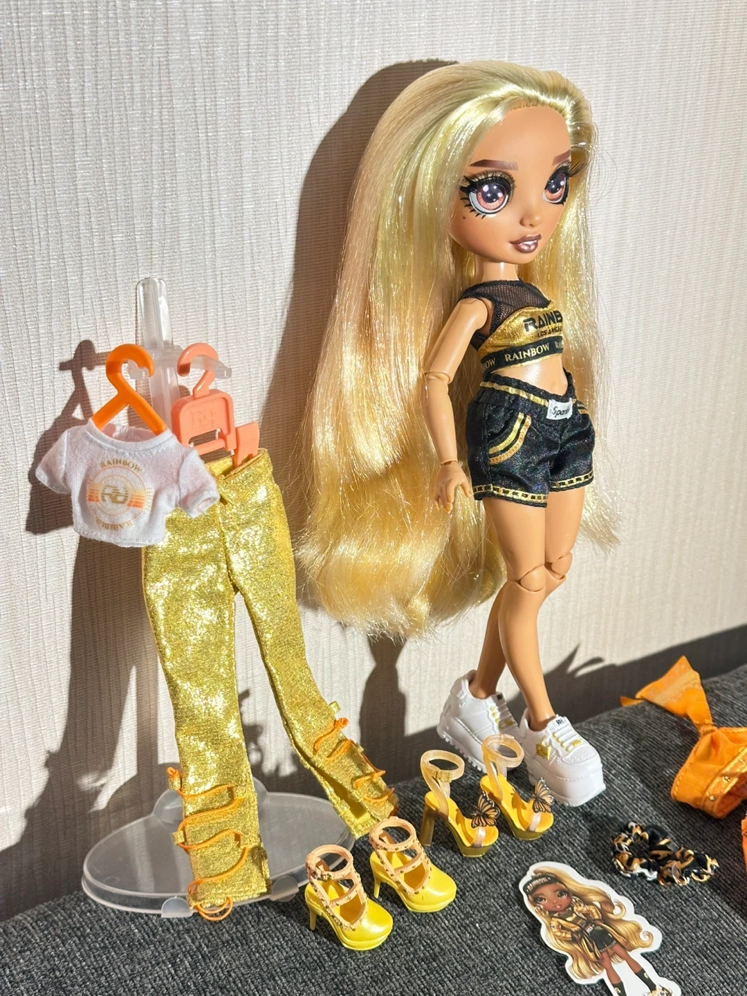 This is a Rainbow High doll with multiple stylish outfits and accessories. It includes a doll, golden sparkly pants, a white t-shirt, yellow sandals, a matching top and shorts set, a cape, and a sticker. It's a great set for imaginative play!