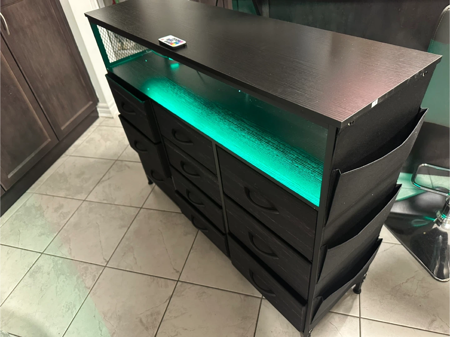 This black dresser features multiple drawers for storage and includes RGB LED lighting that can be controlled with a remote. It has a modern design with fabric side pockets.