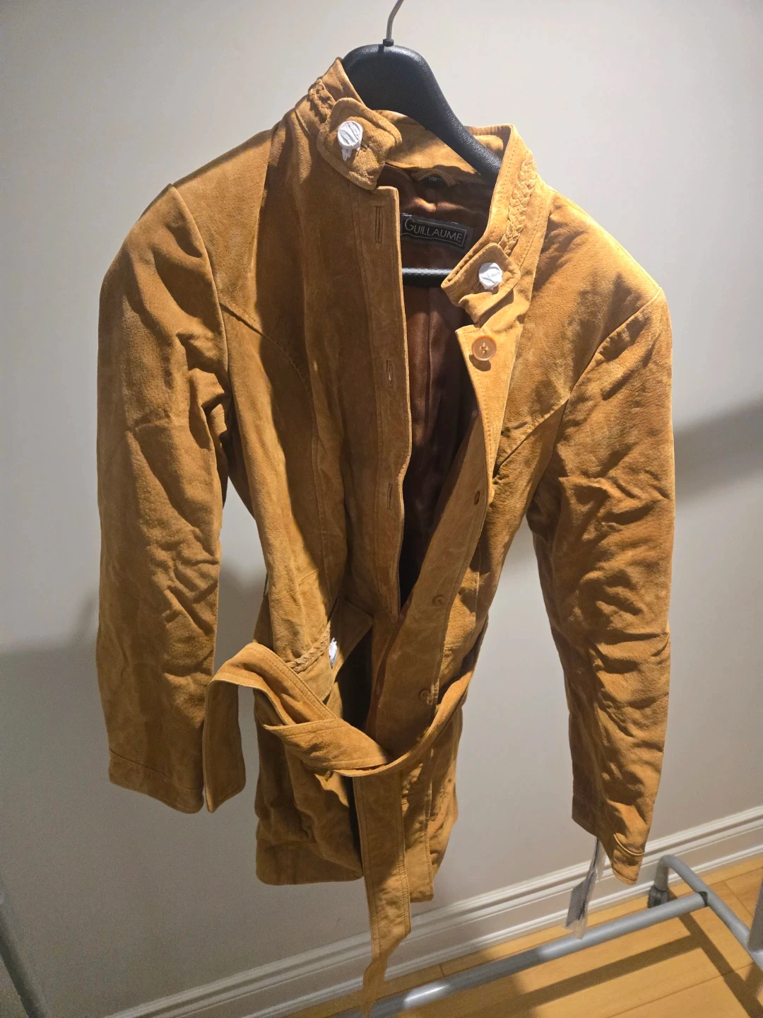 This is a stylish tan suede jacket by Guillaume. It features a belted waist for a cinched look and button-up closure. A classic piece for any wardrobe!