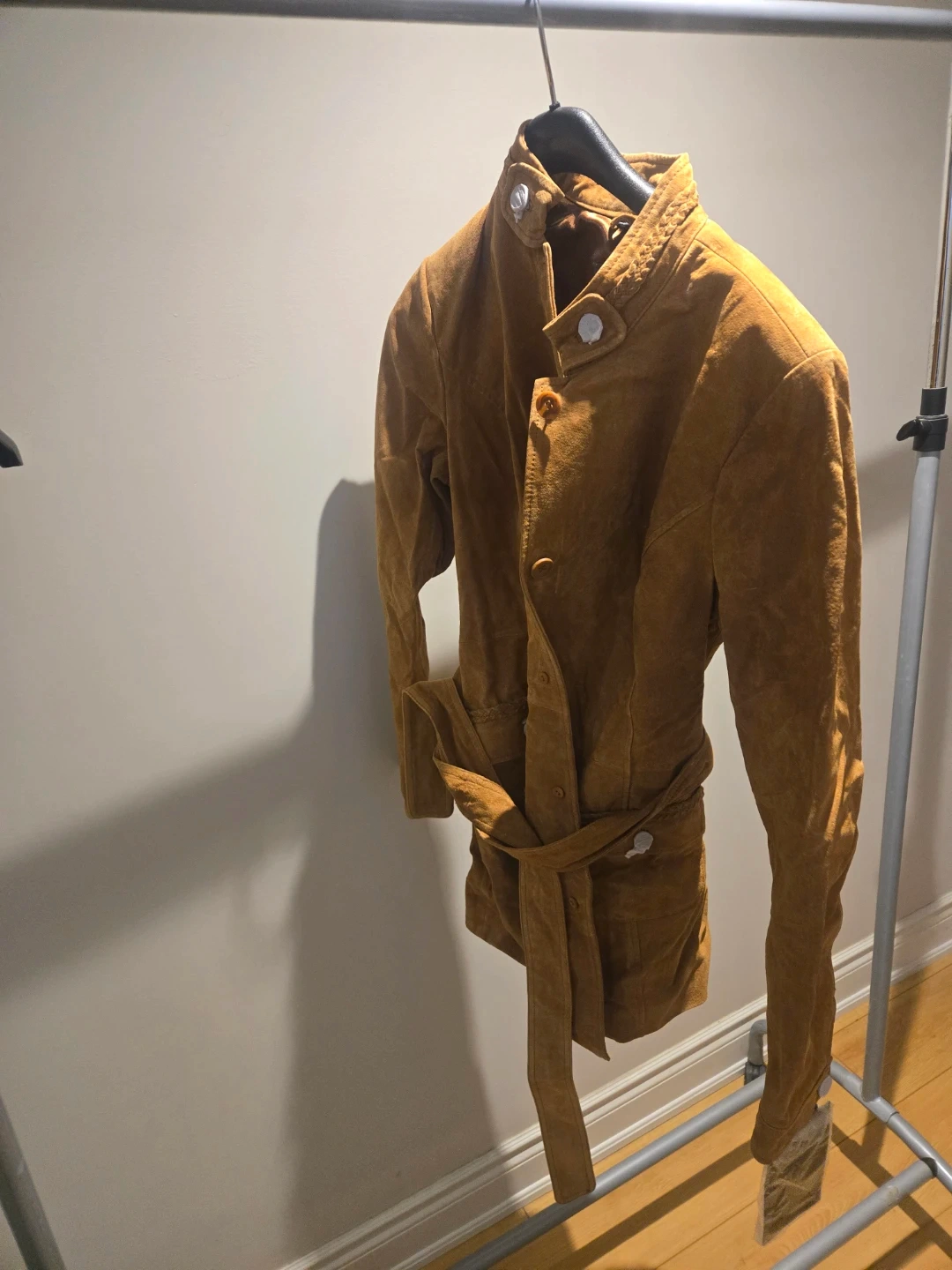 This is a stylish tan suede jacket by Guillaume. It features a belted waist for a cinched look and button-up closure. A classic piece for any wardrobe!