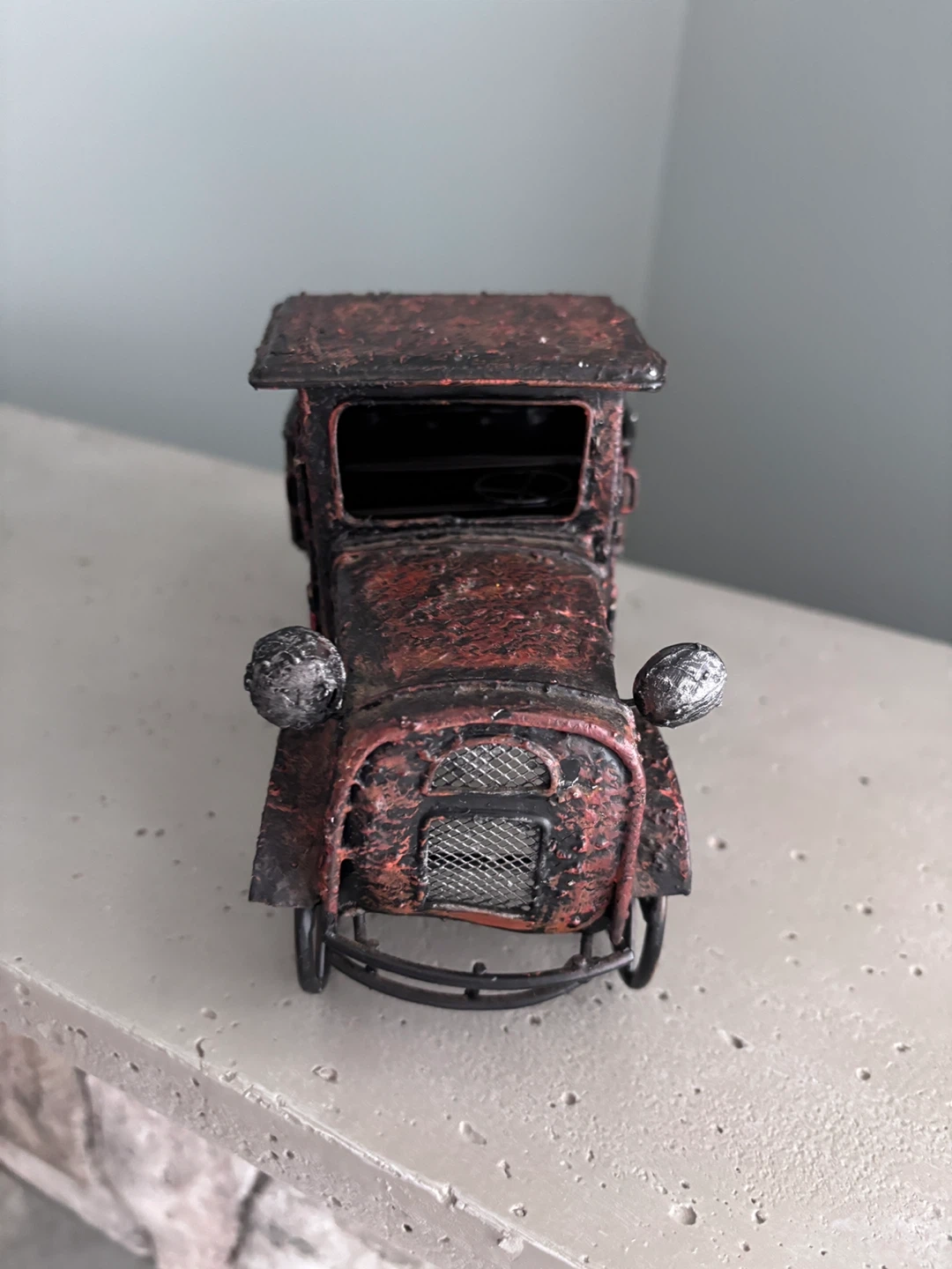 This is a vintage-style metal toy truck, perfect for decoration. It's made of metal and has a rustic, distressed red and black finish. This decorative piece adds a touch of old-world charm to any shelf or table.